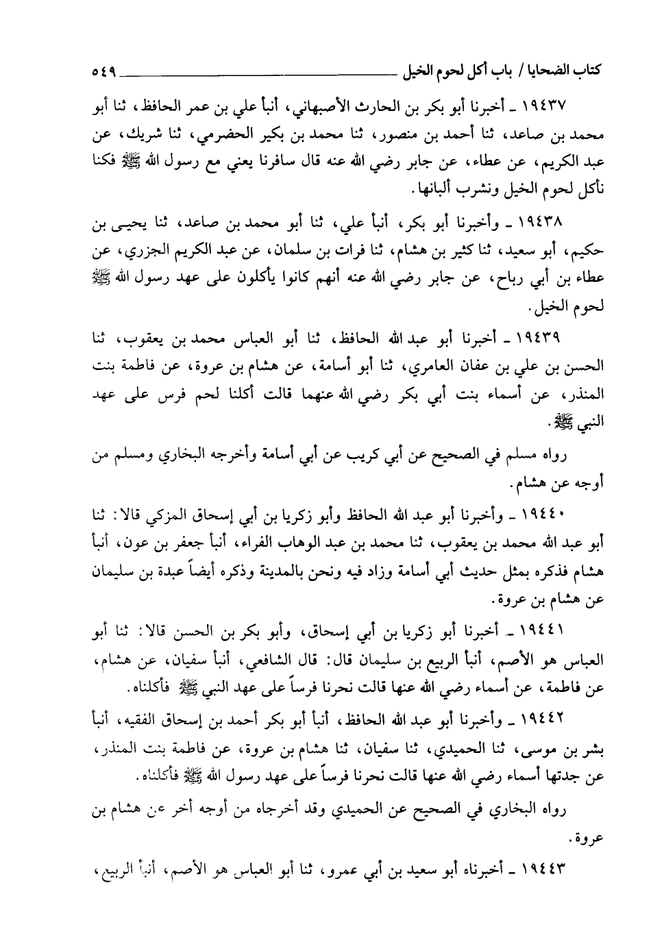 19442 - وَأَخْبَرَنَا أَبُو عَبْدِ اللهِ الْحَافِظُ، أنبأ أَبُو بَكْرٍ أَحْمَدُ بْنُ إِسْحَاقَ الْفَقِيهُ , أنبأ بِشْرُ بْنُ مُوسَى، ثنا الْحُمَيْدِيُّ، ثنا سُفْيَانُ، ثنا هِشَامُ بْنُ عُرْوَةَ، عَنْ فَاطِمَةَ بِنْتِ الْمُنْذِرِ، عَنْ جَدَّتِهَا أَسْمَاءَ رَضِيَ اللهُ عَنْهَا قَالَتْ: §نَحَرْنَا فَرَسًا عَلَى عَهْدِ رَسُولِ اللهِ صَلَّى اللهُ عَلَيْهِ وَسَلَّمَ فَأَكَلْنَاهُ. رَوَاهُ الْبُخَارِيُّ فِي الصَّحِيحِ عَنِ الْحُمَيْدِيِّ , وَقَدْ أَخْرَجَاهُ مِنْ أَوْجُهٍ أُخَرَ عَنْ هِشَامِ بْنِ عُرْوَةَ