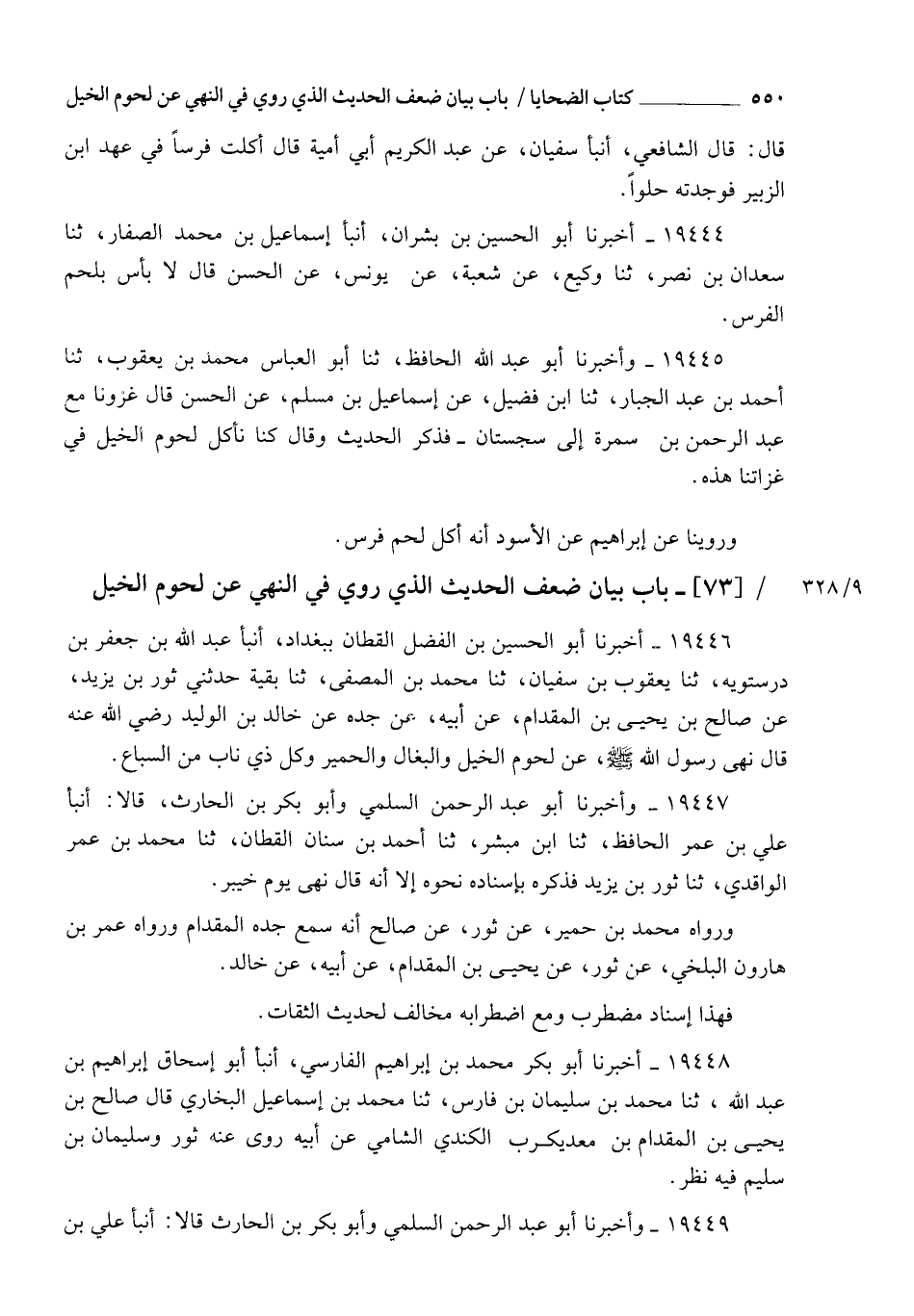 19445 - وَأَخْبَرَنَا أَبُو عَبْدِ اللهِ الْحَافِظُ، ثنا أَبُو الْعَبَّاسِ مُحَمَّدُ بْنُ يَعْقُوبَ , ثنا أَحْمَدُ بْنُ عَبْدِ الْجَبَّارِ، ثنا ابْنُ فُضَيْلٍ، عَنْ إِسْمَاعِيلَ بْنِ مُسْلِمٍ، عَنِ الْحَسَنِ، قَالَ: غَزَوْنَا مَعَ عَبْدِ الرَّحْمَنِ بْنِ سَمُرَةَ إِلَى سِجِسْتَانَ فَذَكَرَ الْحَدِيثَ , وَقَالَ: §كُنَّا نَأْكُلُ لُحُومَ الْخَيْلِ فِي غَزَاتِنَا هَذِهِ. وَرُوِّينَا عَنْ إِبْرَاهِيمَ، عَنِ الْأَسْوَدِ، أَنَّهُ أَكَلَ لَحْمَ فَرَسٍ