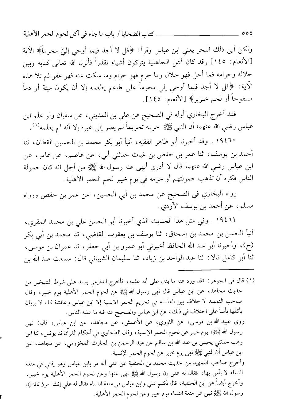 19460 - وَقَدْ أَخْبَرَنَا أَبُو طَاهِرٍ الْفَقِيهُ، أنبأ أَبُو بَكْرٍ مُحَمَّدُ بْنُ الْحُسَيْنِ الْقَطَّانُ , ثنا أَحْمَدُ بْنُ يُوسُفَ، ثنا عُمَرُ بْنُ حَفْصِ بْنِ غِيَاثٍ، حَدَّثَنِي أَبِي، عَنْ عَاصِمٍ، عَنْ عَامِرٍ، عَنِ ابْنِ عَبَّاسٍ رَضِيَ اللهُ عَنْهُمَا قَالَ: §لَا أَدْرِي أَنَهَى عَنْهُ رَسُولُ اللهِ صَلَّى اللهُ عَلَيْهِ وَسَلَّمَ مِنْ أَجْلِ أَنَّهُ كَانَ حَمُولَةَ النَّاسِ فَكَرِهَ أَنْ تَذْهَبَ حَمُولَتُهُمْ , أَوْ حَرَّمَهُ فِي يَوْمِ خَيْبَرَ لَحْمَ الْحُمُرِ الْأَهْلِيَّةِ. رَوَاهُ الْبُخَارِيُّ فِي الصَّحِيحِ عَنْ مُحَمَّدِ بْنِ أَبِي الْحُسَيْنِ , عَنْ عُمَرَ بْنِ حَفْصٍ , وَرَوَاهُ مُسْلِمٌ عَنْ أَحْمَدَ بْنِ يُوسُفَ الْأَزْدِيِّ