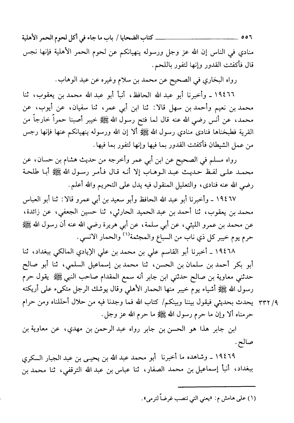19466 - وَأَخْبَرَنَا أَبُو عَبْدِ اللهِ الْحَافِظُ، أنبأ أَبُو عَبْدِ اللهِ مُحَمَّدُ بْنُ يَعْقُوبَ , ثنا مُحَمَّدُ بْنُ نُعَيْمٍ، وَأَحْمَدُ بْنُ سَهْلٍ قَالَا: ثنا ابْنُ أَبِي عُمَرَ، ثنا سُفْيَانُ، عَنْ أَيُّوبَ، عَنْ مُحَمَّدٍ، عَنْ أَنَسٍ رَضِيَ اللهُ عَنْهُ قَالَ: لَمَّا فَتَحَ رَسُولُ اللهِ صَلَّى اللهُ عَلَيْهِ وَسَلَّمَ خَيْبَرَ §أَصَبْنَا حُمُرًا خَارِجًا مِنَ الْقَرْيَةَ فَطَبَخْنَاهَا , فَنَادَى مُنَادِي رَسُولِ اللهِ صَلَّى اللهُ عَلَيْهِ وَسَلَّمَ: أَلَا إِنَّ اللهَ وَرَسُولَهُ يَنْهَيَانِكُمْ عَنْهَا فَإِنَّهَا رِجْسٌ مِنْ عَمَلِ الشَّيْطَانِ , فَأُكْفِئَتِ الْقُدُورُ بِمَا فِيهَا وَإِنَّهَا لَتَفُورُ بِمَا فِيهَا. رَوَاهُ مُسْلِمٌ فِي الصَّحِيحِ عَنِ ابْنِ أَبِي عُمَرَ , وَأَخْرَجَهُ مِنْ حَدِيثِ هِشَامِ بْنِ حَسَّانَ عَنْ مُحَمَّدٍ عَلَى لَفْظِ حَدِيثِ عَبْدِ الْوَهَّابِ , إِلَّا أَنَّهُ قَالَ: فَأَمَرَ رَسُولُ اللهِ صَلَّى اللهُ عَلَيْهِ وَسَلَّمَ أَبَا طَلْحَةَ رَضِيَ اللهُ عَنْهُ فَنَادَى , وَالتَّعْلِيلُ الْمَنْقُولُ فِيهِ يَدُلُّ عَلَى التَّحْرِيمِ , وَاللهُ أَعْلَمُ