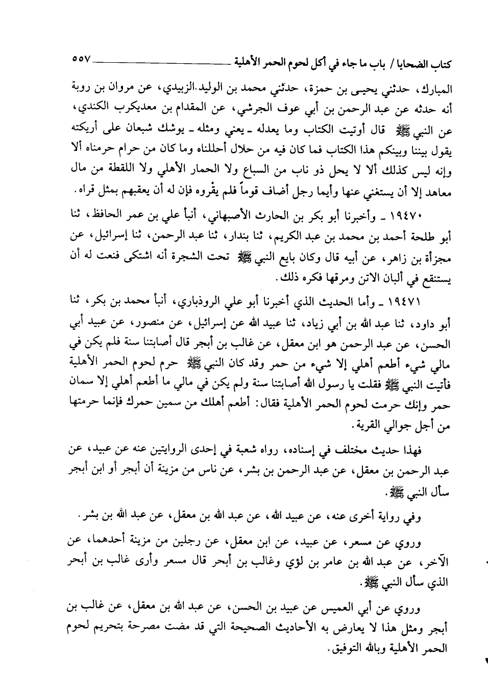 19471 - وَأَمَّا الْحَدِيثُ الَّذِي أَخْبَرَنَا أَبُو عَلِيٍّ الرُّوذْبَارِيُّ، أنبأ مُحَمَّدُ بْنُ بَكْرٍ، ثنا أَبُو دَاوُدَ، ثنا عَبْدُ اللهِ بْنُ أَبِي زِيَادٍ، ثنا عُبَيْدُ اللهِ، عَنْ إِسْرَائِيلَ، عَنْ مَنْصُورٍ، عَنْ عُبَيْدٍ أَبِي الْحَسَنِ، عَنْ عَبْدِ الرَّحْمَنِ هُوَ ابْنُ مَعْقِلٍ , عَنْ غَالِبِ بْنِ أَبْجَرَ، قَالَ: أَصَابَتْنَا سَنَةٌ فَلَمْ يَكُنْ فِي مَالِي شَيْءٌ أُطْعِمُ أَهْلِي إِلَّا شَيْءٌ مِنْ حُمُرٍ , وَقَدْ كَانَ النَّبِيُّ صَلَّى اللهُ عَلَيْهِ وَسَلَّمَ حَرَّمَ لُحُومَ الْحُمُرِ الْأَهْلِيَّةِ , فَأَتَيْتُ النَّبِيَّ صَلَّى اللهُ عَلَيْهِ وَسَلَّمَ فَقُلْتُ: يَا رَسُولَ اللهِ أَصَابَتْنَا سَنَةٌ وَلَمْ يَكُنْ فِي مَالِي مَا أُطْعِمُ أَهْلِي إِلَّا سِمَانَ حُمُرٍ , وَإِنَّكَ حَرَّمْتَ لُحُومَ الْحُمُرِ الْأَهْلِيَّةِ , فَقَالَ: §أَطْعِمْ أَهْلَكَ مِنْ سَمِينِ حُمُرِكَ فَإِنَّمَا حَرَّمْتُهَا مِنْ أَجْلِ جَوَّالِي الْقَرْيَةِ ". فَهَذَا حَدِيثٌ مُخْتَلَفٌ فِي إِسْنَادِهِ , رَوَاهُ شُعْبَةُ فِي إِحْدَى الرِّوَايَتَيْنِ عَنْهُ عَنْ عُبَيْدٍ , عَنْ عَبْدِ الرَّحْمَنِ بْنِ مَعْقِلٍ , عَنْ عَبْدِ الرَّحْمَنِ بْنِ بِشْرٍ , عَنْ نَاسٍ مِنْ مُزَيْنَةَ أَنَّ أَبْجَرَ أَوِ ابْنَ أَبْجَرَ سَأَلَ النَّبِيَّ صَلَّى اللهُ عَلَيْهِ وَسَلَّمَ , وَفِي رِوَايَةٍ أُخْرَى عَنْهُ عَنْ عُبَيْدِ اللهِ , عَنْ عَبْدِ اللهِ بْنِ مَعْقِلٍ , عَنْ عَبْدِ اللهِ بْنِ بِشْرٍ , وَرُوِيَ عَنْ مِسْعَرٍ , عَنْ عُبَيْدٍ , عَنِ ابْنِ مَعْقِلٍ , عَنْ رَجُلَيْنِ مِنْ مُزَيْنَةَ أَحَدُهُمَا عَنِ الْآخَرِ , عَنْ عَبْدِ اللهِ بْنِ عَامِرِ بْنِ لُؤَيٍّ وَغَالِبِ بْنِ أَبْجَرَ , قَالَ مِسْعَرٌ: وَأَرَى غَالِبَ بْنَ أَبْجَرَ الَّذِي سَأَلَ النَّبِيَّ صَلَّى اللهُ عَلَيْهِ وَسَلَّمَ. وَرُوِيَ عَنْ أَبِي الْعُمَيْسِ , عَنْ عُبَيْدِ بْنِ الْحَسَنِ , عَنْ عَبْدِ اللهِ بْنِ مَعْقِلٍ , عَنْ غَالِبِ بْنِ أَبْجَرَ , وَمِثْلُ هَذَا لَا يُعَارَضُ بِهِ الْأَحَادِيثُ الصَّحِيحَةُ الَّتِي قَدْ مَضَتْ مُصَرِّحَةً بِتَحْرِيمِ لُحُومِ الْحُمُرِ الْأَهْلِيَّةِ , وَبِاللهِ التَّوْفِيقُ