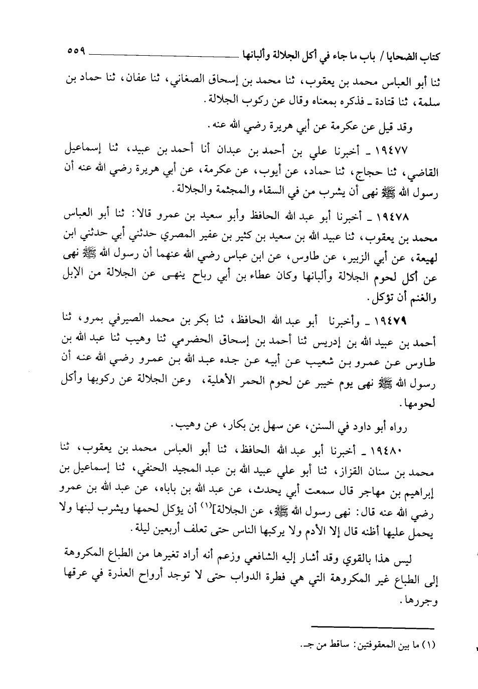 19479 - وَأَخْبَرَنَا أَبُو عَبْدِ اللهِ الْحَافِظُ، ثنا بَكْرُ بْنُ مُحَمَّدٍ الصَّيْرَفِيُّ بِمَرْوَ , ثنا أَحْمَدُ بْنُ عُبَيْدِ اللهِ بْنِ إِدْرِيسَ، ثنا أَحْمَدُ بْنُ إِسْحَاقَ الْحَضْرَمِيُّ، ثنا وَهَيْبٌ، ثنا عَبْدُ اللهِ بْنُ طَاوُسٍ، عَنْ عَمْرِو بْنِ شُعَيْبٍ، عَنْ أَبِيهِ، عَنْ جَدِّهِ عَبْدِ اللهِ بْنِ عَمْرٍو رَضِيَ اللهُ عَنْهُ , أَنَّ رَسُولَ اللهِ صَلَّى اللهُ عَلَيْهِ وَسَلَّمَ §نَهَى يَوْمَ خَيْبَرَ عَنْ لُحُومِ الْحُمُرِ الْأَهْلِيَّةِ وَعَنِ الْجَلَّالَةِ عَنْ رُكُوبِهَا وَأَكْلِ لُحُومِهَا. رَوَاهُ أَبُو دَاوُدَ فِي السُّنَنِ عَنْ سَهْلِ بْنِ بَكَّارٍ عَنْ وُهَيْبٍ