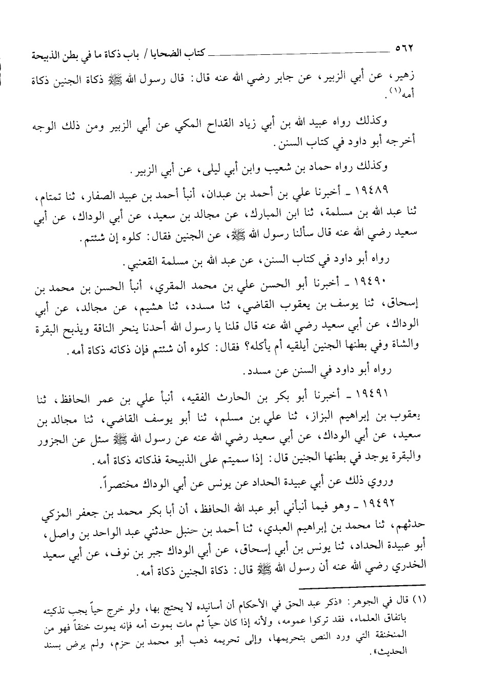 19492 - وَهُوَ فِيمَا أَنْبَأَنِي أَبُو عَبْدِ اللهِ الْحَافِظُ أَنَّ أَبَا بَكْرٍ مُحَمَّدَ بْنَ جَعْفَرٍ الْمُزَكِّيَ حَدَّثَهُمْ، ثنا مُحَمَّدُ بْنُ إِبْرَاهِيمَ الْعَبْدِيُّ، ثنا أَحْمَدُ بْنُ حَنْبَلٍ، حَدَّثَنِي عَبْدُ الْوَاحِدِ بْنُ وَاصِلٍ أَبُو عُبَيْدَةَ الْحَدَّادُ، ثنا يُونُسُ بْنُ أَبِي إِسْحَاقَ، عَنْ أَبِي الْوَدَّاكِ جَبْرِ بْنِ نَوْفٍ , عَنْ أَبِي سَعِيدٍ الْخُدْرِيِّ رَضِيَ اللهُ عَنْهُ , أَنَّ رَسُولَ اللهِ صَلَّى اللهُ عَلَيْهِ وَسَلَّمَ قَالَ: §" ذَكَاةُ الْجَنِينِ ذَكَاةُ أُمِّهِ ". -[563]- وَفِي الْبَابِ عَنْ عَلِيٍّ , وَعَبْدِ اللهِ بْنِ مَسْعُودٍ , وَعَبْدِ اللهِ بْنِ عُمَرَ , وَعَبْدِ اللهِ بْنِ عَبَّاسٍ , وَأَبِي أَيُّوبَ , وَأَبِي هُرَيْرَةَ , وَأَبِي الدَّرْدَاءِ , وَأَبِي أُمَامَةَ , وَالْبَرَاءِ بْنِ عَازِبٍ رَضِيَ اللهُ عَنْهُمْ مَرْفُوعًا وَفِي حَدِيثِ الزُّهْرِيِّ عَنِ ابْنِ كَعْبِ بْنِ مَالِكٍ أَنَّهُ قَالَ: كَانَ أَصْحَابُ رَسُولِ اللهِ صَلَّى اللهُ عَلَيْهِ وَسَلَّمَ يَقُولُونَ فِي الْجَنِينِ: إِذَا أَشْعَرَ فَذَكَاتُهُ ذَكَاةُ أُمِّهِ