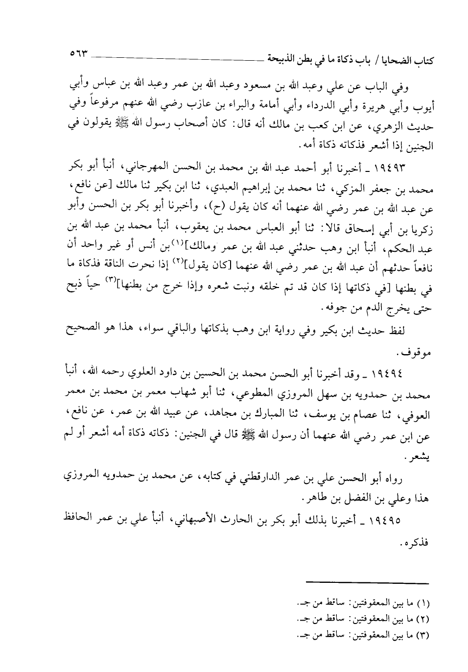 19494 - وَقَدْ أَخْبَرَنَا أَبُو الْحَسَنِ مُحَمَّدُ بْنُ الْحُسَيْنِ بْنِ دَاوُدَ الْعَلَوِيُّ رَحِمَهُ اللهُ , أنبأ مُحَمَّدُ بْنُ حَمْدَوَيْهِ بْنِ سَهْلٍ الْمَرْوَزِيُّ الْمُطَّوِّعِيُّ، ثنا أَبُو شِهَابٍ مَعْمَرُ بْنُ مُحَمَّدِ بْنِ مَعْمَرٍ الْعَوْفِيُّ , ثنا عِصَامُ بْنُ يُوسُفَ، ثنا الْمُبَارَكُ بْنُ مُجَاهِدٍ، عَنْ عُبَيْدِ اللهِ بْنِ عُمَرَ، عَنْ نَافِعٍ، عَنِ ابْنِ عُمَرَ رَضِيَ اللهُ عَنْهُمَا , أَنَّ رَسُولَ اللهِ صَلَّى اللهُ عَلَيْهِ وَسَلَّمَ قَالَ فِي الْجَنِينِ: §" ذَكَاتُهُ ذَكَاةُ أُمِّهِ أَشْعَرَ أَوْ لَمْ يُشْعِرْ ". رَوَاهُ أَبُو الْحَسَنِ عَلِيُّ بْنُ عُمَرَ الدَّارَقُطْنِيُّ فِي كِتَابِهِ عَنْ مُحَمَّدِ بْنِ حَمْدَوَيْهِ الْمَرْوَزِيِّ هَذَا , وَعَلِيِّ بْنِ الْفَضْلِ بْنِ طَاهِرٍ.