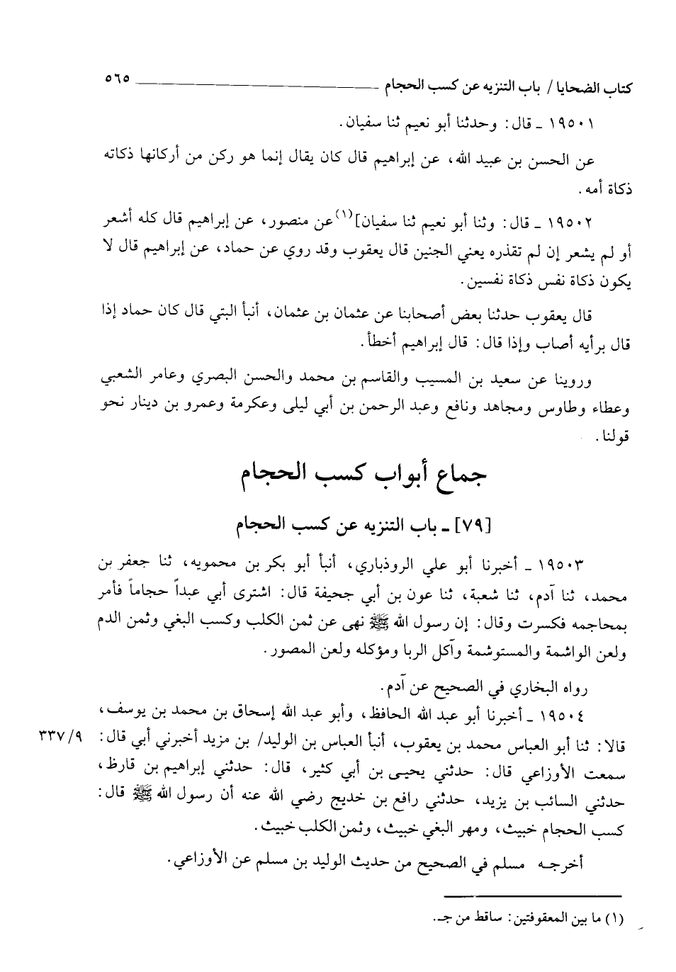 19504 - أَخْبَرَنَا أَبُو عَبْدِ اللهِ الْحَافِظُ، وَأَبُو عَبْدِ اللهِ إِسْحَاقُ بْنُ مُحَمَّدِ بْنِ يُوسُفَ قَالَا: ثنا أَبُو الْعَبَّاسِ مُحَمَّدُ بْنُ يَعْقُوبَ , أنبأ الْعَبَّاسُ بْنُ الْوَلِيدِ بْنِ مَزْيَدٍ، أَخْبَرَنِي أَبِي قَالَ: سَمِعْتُ الْأَوْزَاعِيَّ قَالَ: حَدَّثَنِي يَحْيَى بْنُ أَبِي كَثِيرٍ قَالَ: حَدَّثَنِي إِبْرَاهِيمُ بْنُ قَارِظٍ، حَدَّثَنِي السَّائِبُ بْنُ يَزِيدَ، حَدَّثَنِي رَافِعُ بْنُ خَدِيجٍ رَضِيَ اللهُ عَنْهُ أَنَّ رَسُولَ اللهِ صَلَّى اللهُ عَلَيْهِ وَسَلَّمَ قَالَ: §" كَسْبُ الْحَجَّامِ خَبِيثٌ , وَمَهْرُ الْبَغِيِّ خَبِيثٌ , وَثَمَنُ الْكَلْبِ خَبِيثٌ ". أَخْرَجَهُ مُسْلِمٌ فِي الصَّحِيحِ مِنْ حَدِيثِ الْوَلِيدِ بْنِ مُسْلِمٍ , عَنِ الْأَوْزَاعِيِّ