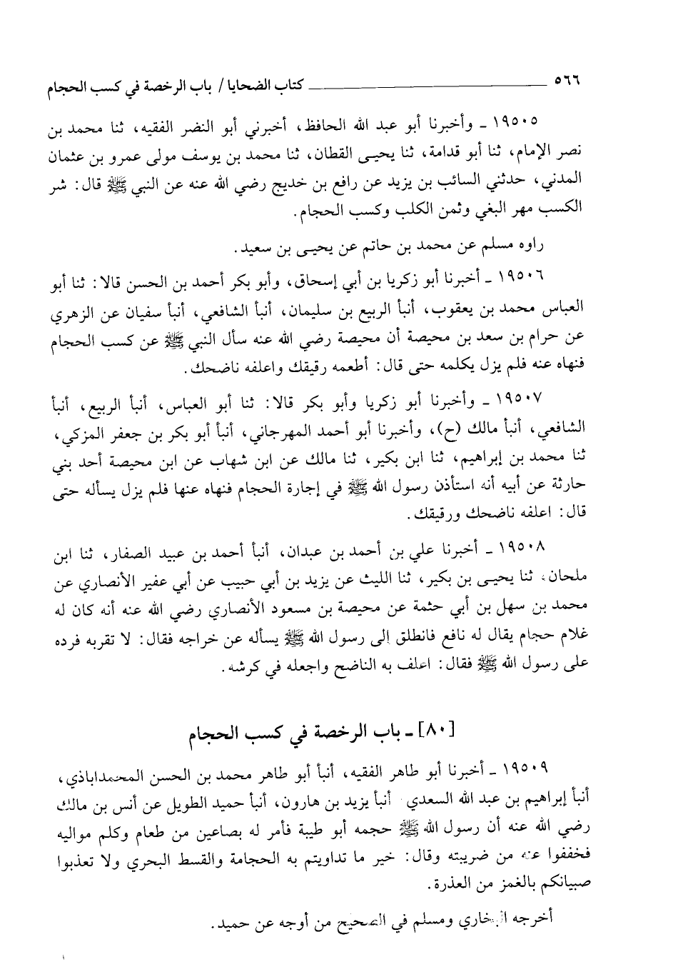 19505 - وَأَخْبَرَنَا أَبُو عَبْدِ اللهِ الْحَافِظُ، أَخْبَرَنِي أَبُو النَّضْرِ الْفَقِيهُ، ثنا مُحَمَّدُ بْنُ نَصْرٍ الْإِمَامُ، ثنا أَبُو قُدَامَةَ، ثنا يَحْيَى الْقَطَّانُ، ثنا مُحَمَّدُ بْنُ يُوسُفَ، مَوْلَى عَمْرِو بْنِ عُثْمَانَ الْمَدَنِيِّ , حَدَّثَنِي السَّائِبُ بْنُ يَزِيدَ، عَنْ رَافِعِ بْنِ خَدِيجٍ رَضِيَ اللهُ عَنْهُ , عَنِ النَّبِيِّ صَلَّى اللهُ عَلَيْهِ وَسَلَّمَ قَالَ: §" شَرُّ الْكَسْبِ مَهْرُ الْبَغِيِّ وَثَمَنُ الْكَلْبِ وَكَسْبُ الْحَجَّامِ ". رَوَاهُ مُسْلِمٌ عَنْ مُحَمَّدِ بْنِ حَاتِمٍ , عَنْ يَحْيَى بْنِ سَعِيدٍ