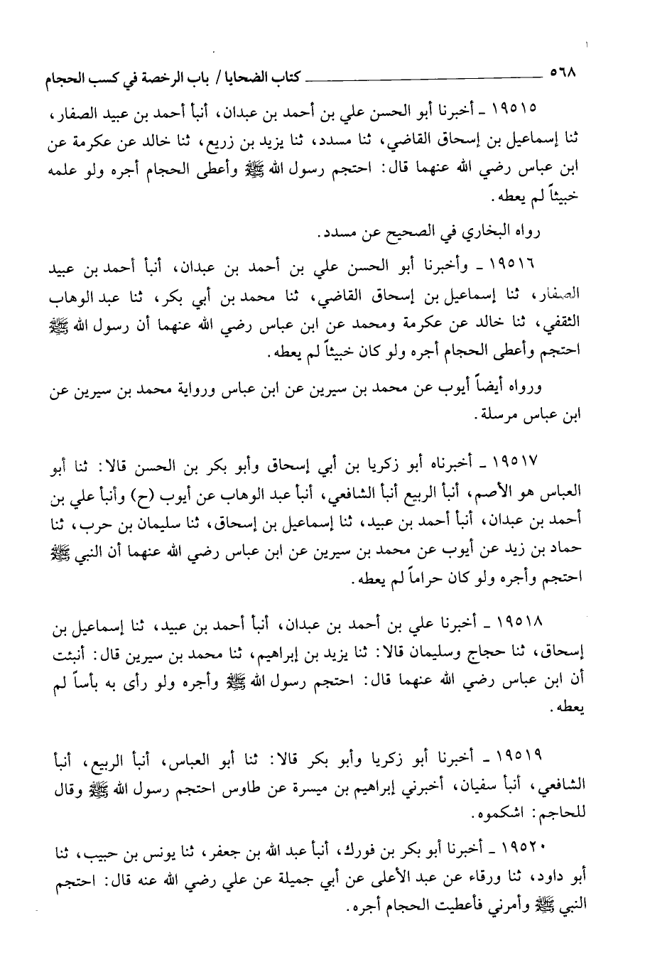 19516 - وَأَخْبَرَنَا أَبُو الْحَسَنِ عَلِيُّ بْنُ أَحْمَدَ بْنِ عَبْدَانَ , أنبأ أَحْمَدُ بْنُ عُبَيْدٍ الصَّفَّارُ، ثنا إِسْمَاعِيلُ بْنُ إِسْحَاقَ الْقَاضِي، ثنا مُحَمَّدُ بْنُ أَبِي بَكْرٍ، ثنا عَبْدُ الْوَهَّابِ الثَّقَفِيُّ، ثنا خَالِدٌ، عَنْ عِكْرِمَةَ وَمُحَمَّدٍ، عَنِ ابْنِ عَبَّاسٍ رَضِيَ اللهُ عَنْهُمَا , أَنَّ رَسُولَ اللهِ صَلَّى اللهُ عَلَيْهِ وَسَلَّمَ §احْتَجَمَ وَأَعْطَى الْحَجَّامَ أَجْرَهُ , وَلَوْ كَانَ خَبِيثًا لَمْ يُعْطِهِ. وَرَوَاهُ أَيْضًا أَيُّوبُ , عَنْ مُحَمَّدِ بْنِ سِيرِينَ , عَنِ ابْنِ عَبَّاسٍ , وَرِوَايَةُ مُحَمَّدِ بْنِ سِيرِينَ عَنِ ابْنِ عَبَّاسٍ مُرْسَلَةٌ