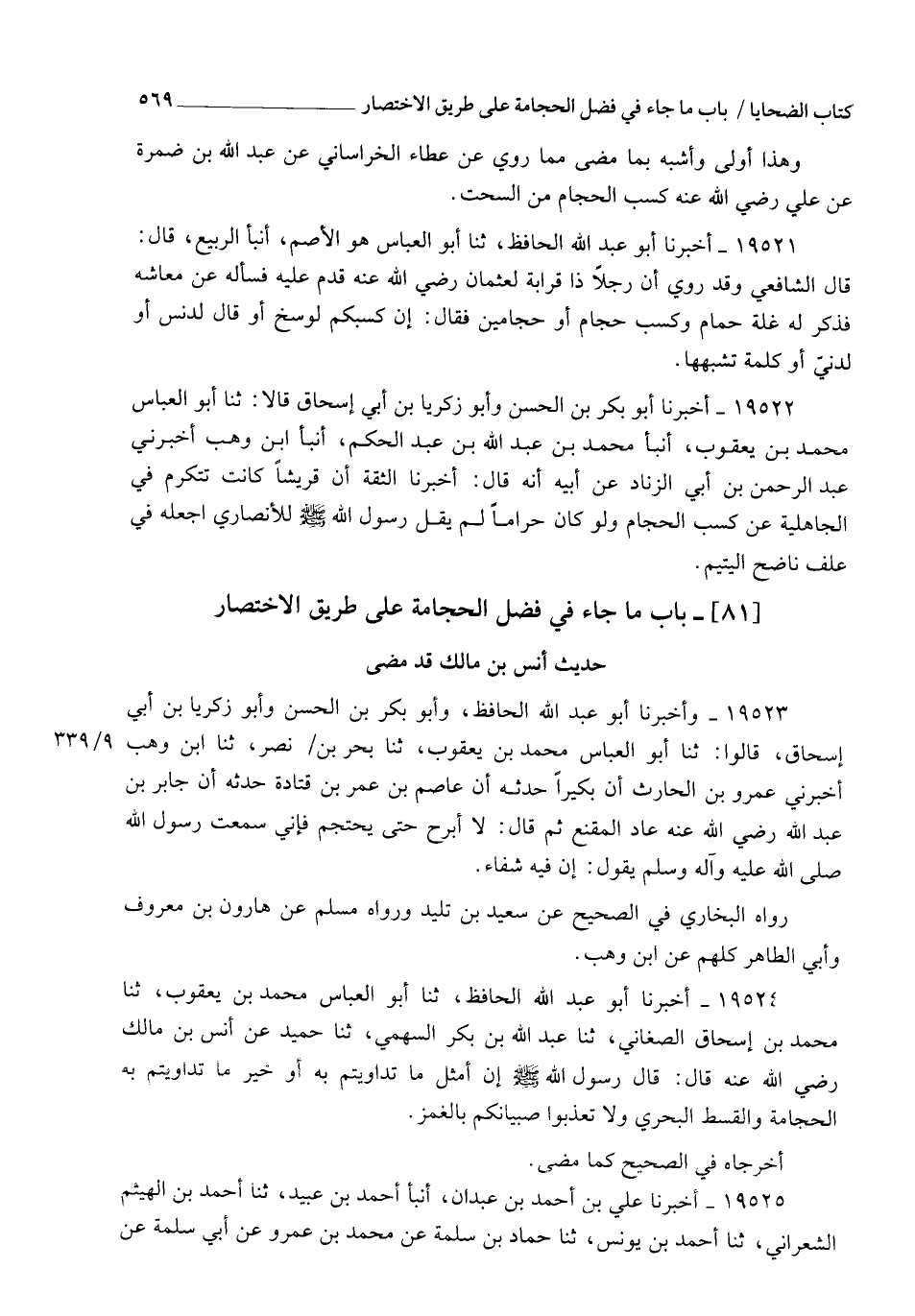 19523 - وَأَخْبَرَنَا أَبُو عَبْدِ اللهِ الْحَافِظُ، وَأَبُو بَكْرِ بْنُ الْحَسَنِ , وَأَبُو زَكَرِيَّا بْنُ أَبِي إِسْحَاقَ قَالُوا: ثنا أَبُو الْعَبَّاسِ مُحَمَّدُ بْنُ يَعْقُوبَ , ثنا بَحْرُ بْنُ نَصْرٍ، ثنا ابْنُ وَهْبٍ، أَخْبَرَنِي عَمْرُو بْنُ الْحَارِثِ أَنَّ بُكَيْرًا حَدَّثَهُ أَنَّ عَاصِمَ بْنَ عُمَرَ بْنِ قَتَادَةَ حَدَّثَهُ أَنَّ جَابِرَ بْنَ عَبْدِ اللهِ رَضِيَ اللهُ عَنْهُ عَادَ الْمُقَنَّعَ ثُمَّ قَالَ: §لَا أَبْرَحُ حَتَّى يَحْتَجِمَ فَإِنِّي سَمِعْتُ رَسُولَ اللهِ صَلَّى الله عَلَيْهِ وَآلِهِ وَسَلَّمَ يَقُولُ: " إِنَّ فِيهِ شِفَاءً ". رَوَاهُ الْبُخَارِيُّ فِي الصَّحِيحِ عَنْ سَعِيدِ بْنِ تَلِيدٍ , وَرَوَاهُ مُسْلِمٌ عَنْ هَارُونَ بْنِ مَعْرُوفٍ , وَأَبِي الطَّاهِرِ , كُلُّهُمْ عَنِ ابْنِ وَهْبٍ