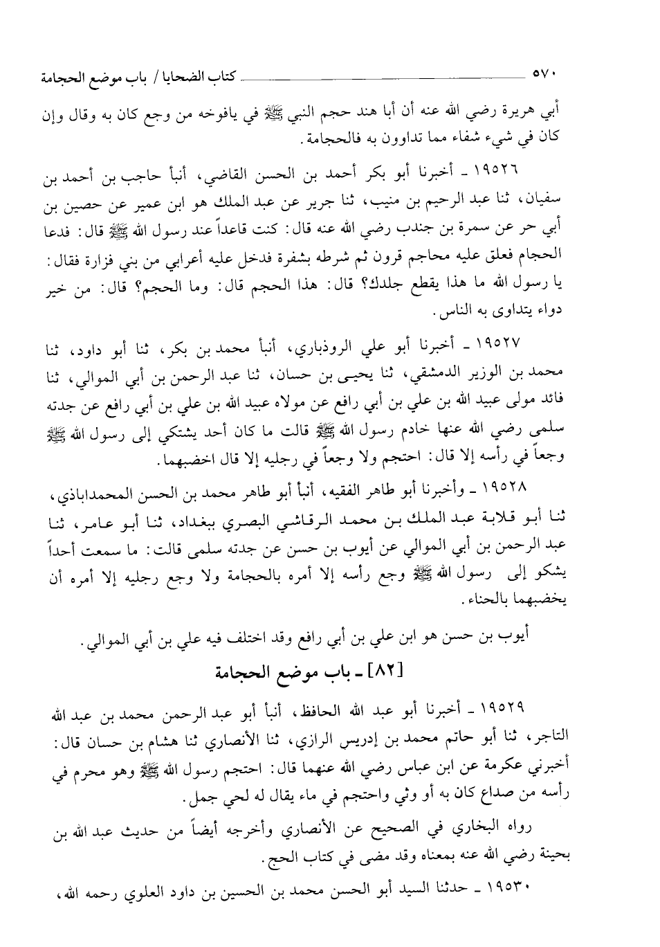 19528 - وَأَخْبَرَنَا أَبُو طَاهِرٍ الْفَقِيهُ، أنبأ أَبُو طَاهِرٍ مُحَمَّدُ بْنُ الْحَسَنِ الْمُحَمَّدْأَبَاذِيُّ , ثنا أَبُو قِلَابَةَ عَبْدُ الْمَلِكِ بْنُ مُحَمَّدٍ الرَّقَاشِيُّ الْبَصْرِيُّ بِبَغْدَادَ , ثنا أَبُو عَامِرٍ، ثنا عَبْدُ الرَّحْمَنِ بْنُ أَبِي الْمَوَالِي، عَنْ أَيُّوبَ بْنِ حَسَنٍ، عَنْ جَدَّتِهِ سَلْمَى قَالَتْ: §مَا سَمِعْتُ أَحَدًا يَشْكُو إِلَى رَسُولِ اللهِ صَلَّى اللهُ عَلَيْهِ وَسَلَّمَ وَجَعَ رَأْسِهِ إِلَّا أَمَرَهُ بِالْحِجَامَةِ , وَلَا وَجَعَ رِجْلَيْهِ إِلَّا أَمَرَهُ أَنْ يَخْضِبَهُمَا بِالْحِنَّاءِ. أَيُّوبُ بْنُ حَسَنٍ هُوَ ابْنُ عَلِيِّ بْنِ أَبِي رَافِعٍ وَقَدِ اخْتُلِفَ فِيهِ عَلَى ابْنِ أَبِي الْمَوَالِي