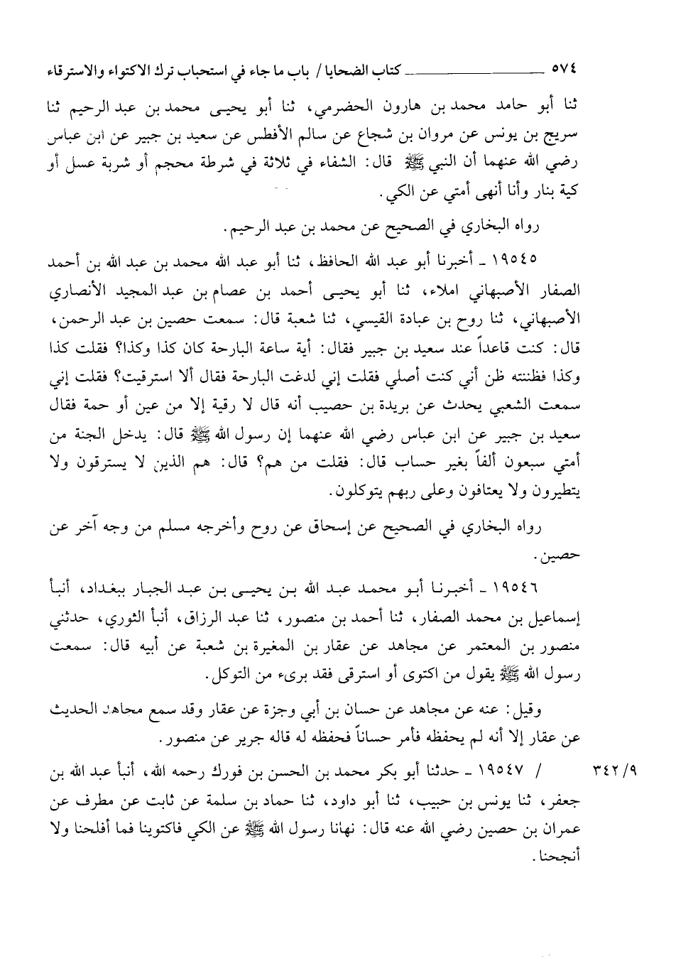 19545 - أَخْبَرَنَا أَبُو عَبْدِ اللهِ الْحَافِظُ، ثنا أَبُو عَبْدِ اللهِ مُحَمَّدُ بْنُ عَبْدِ اللهِ بْنِ أَحْمَدَ الصَّفَّارُ الْأَصْبَهَانِيُّ إِمْلَاءً , ثنا أَبُو يَحْيَى أَحْمَدُ بْنُ عِصَامِ بْنِ عَبْدِ الْمَجِيدِ الْأَنْصَارِيُّ الْأَصْبَهَانِيُّ , ثنا رَوْحُ بْنُ عُبَادَةَ الْقَيْسِيُّ، ثنا شُعْبَةُ، قَالَ: سَمِعْتُ حُصَيْنَ بْنَ عَبْدِ الرَّحْمَنِ قَالَ: كُنْتُ قَاعِدًا عِنْدَ سَعِيدِ بْنِ جُبَيْرٍ فَقَالَ: أَيَّةُ سَاعَةٍ الْبَارِحَةَ كَانَ كَذَا وَكَذَا؟ فَقُلْتُ: كَذَا وَكَذَا , فَظَنَنْتُهُ ظَنَّ أَنِّي كُنْتُ أُصَلِّي فَقُلْتُ: إِنِّي لُدِغْتُ الْبَارِحَةَ , فَقَالَ: أَلَا اسْتَرْقَيْتَ؟ فَقُلْتُ: إِنِّي سَمِعْتُ الشَّعْبِيَّ يُحَدِّثُ عَنْ بُرَيْدَةَ بْنِ حُصَيْبٍ أَنَّهُ قَالَ: لَا رُقْيَةَ إِلَّا مِنْ عَيْنٍ أَوْ حُمَةٍ. فَقَالَ سَعِيدُ بْنُ جُبَيْرٍ عَنِ ابْنِ عَبَّاسٍ رَضِيَ اللهُ عَنْهُمَا , أَنَّ رَسُولَ اللهِ صَلَّى اللهُ عَلَيْهِ وَسَلَّمَ قَالَ: §" يَدْخُلُ الْجَنَّةَ مِنْ أُمَّتِي سَبْعُونَ أَلْفًا بِغَيْرِ حِسَابٍ ". قَالَ: فَقُلْتُ: مَنْ هُمْ؟ قَالَ: " هُمُ الَّذِينَ لَا يَسْتَرْقُونَ , وَلَا يَتَطَيَّرُونَ , وَلَا يَعْتَافُونَ , وَعَلَى رَبِّهِمْ يَتَوَكَّلُونَ ". رَوَاهُ الْبُخَارِيُّ فِي الصَّحِيحِ عَنْ إِسْحَاقَ عَنْ رَوْحٍ , وَأَخْرَجَهُ مُسْلِمٌ مِنْ وَجْهٍ آخَرَ عَنْ حُصَيْنٍ