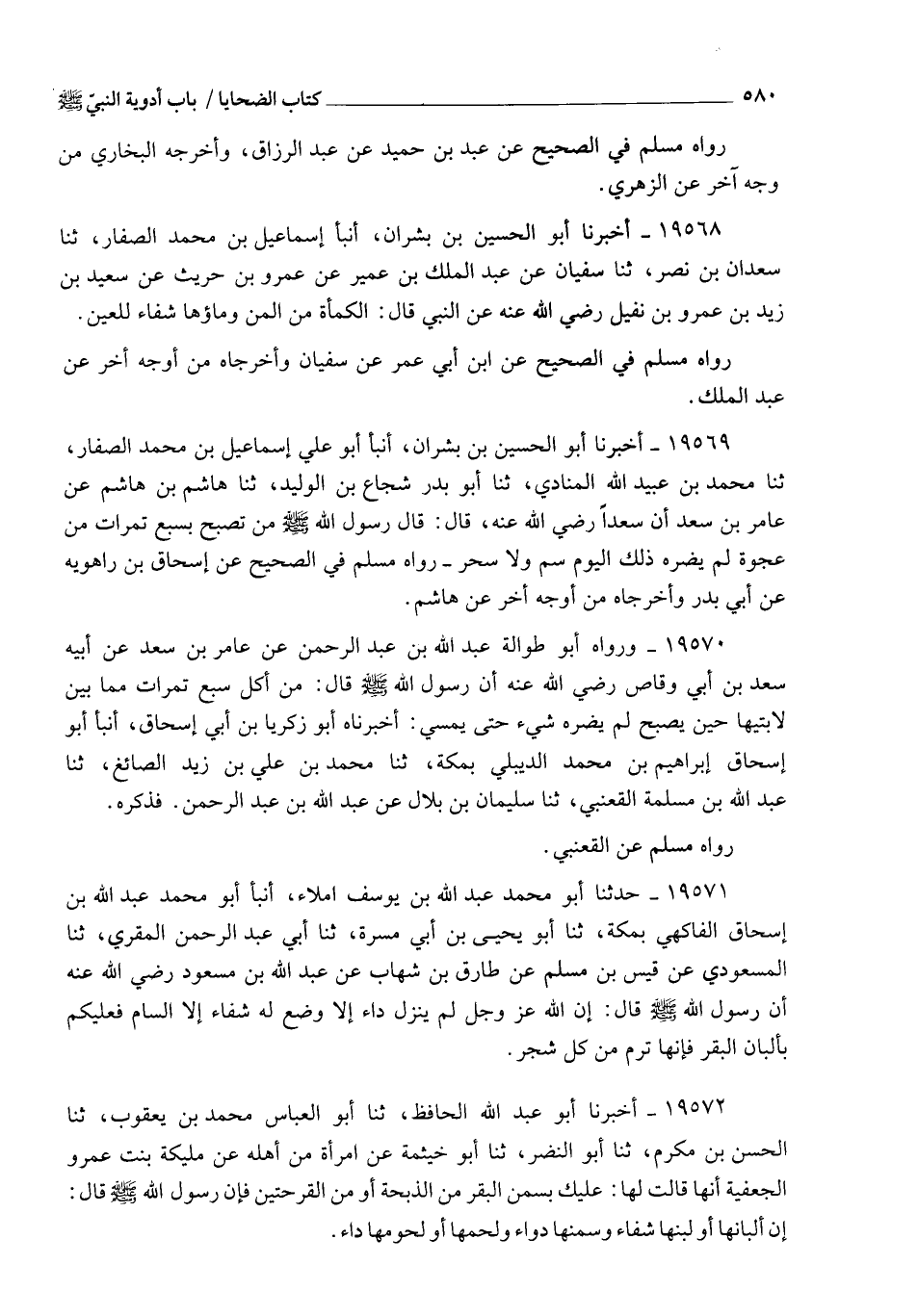 19569 - أَخْبَرَنَا أَبُو الْحُسَيْنِ بْنُ بِشْرَانَ، أنبأ أَبُو عَلِيٍّ إِسْمَاعِيلُ بْنُ مُحَمَّدٍ الصَّفَّارُ , ثنا مُحَمَّدُ بْنُ عُبَيْدِ اللهِ الْمُنَادِي، ثنا أَبُو بَدْرٍ شُجَاعُ بْنُ الْوَلِيدِ , ثنا هَاشِمُ بْنُ هَاشِمٍ، عَنْ عَامِرِ بْنِ سَعْدٍ، أَنِّ سَعْدًا رَضِيَ اللهُ عَنْهُ قَالَ: قَالَ رَسُولُ اللهِ صَلَّى اللهُ عَلَيْهِ وَسَلَّمَ: §" مَنْ تَصَبَّحَ بِسَبْعِ تَمَرَاتٍ مِنْ عَجْوَةٍ لَمْ يَضُرَّهُ ذَلِكَ الْيَوْمَ سُمٌّ وَلَا سِحْرٌ ". رَوَاهُ مُسْلِمٌ فِي الصَّحِيحِ عَنْ إِسْحَاقَ بْنِ رَاهَوَيْهِ , عَنْ أَبِي بَدْرٍ , وَأَخْرَجَاهُ مِنْ أَوْجُهٍ أُخَرَ عَنْ هَاشِمٍ