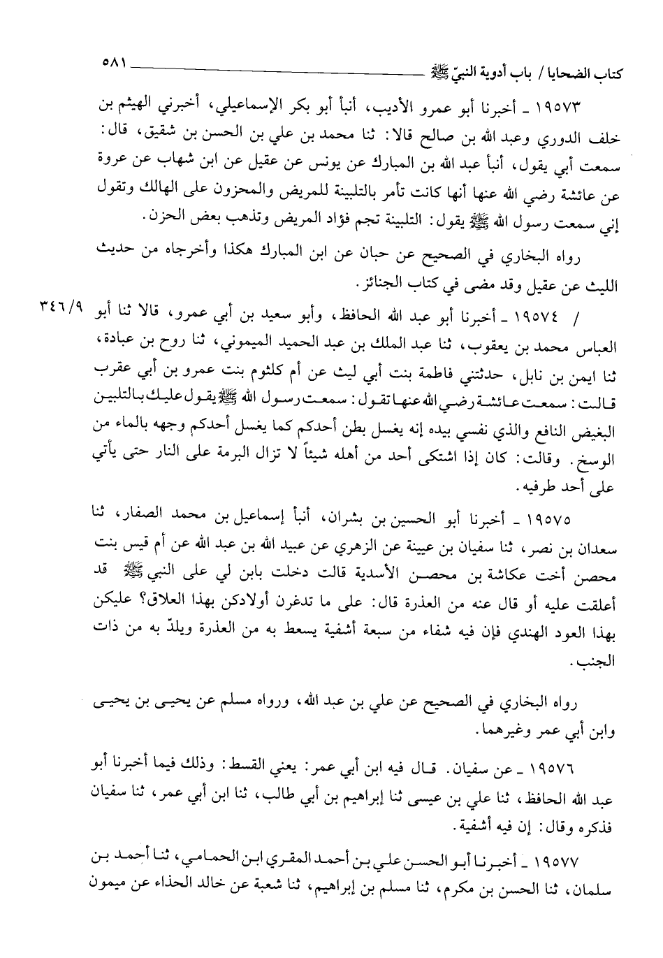 19573 - أَخْبَرَنَا أَبُو عَمْرٍو الْأَدِيبُ، أنبأ أَبُو بَكْرٍ الْإِسْمَاعِيلِيُّ، أَخْبَرَنِي الْهَيْثَمُ بْنُ خَلَفٍ الدُّورِيُّ، وَعَبْدُ اللهِ بْنُ صَالِحٍ قَالَا: ثنا مُحَمَّدُ بْنُ عَلِيِّ بْنِ الْحَسَنِ بْنِ شَقِيقٍ، قَالَ: سَمِعْتُ أَبِي يَقُولُ: أنبأ عَبْدُ اللهِ بْنُ الْمُبَارَكِ، عَنْ يُونُسَ، عَنْ عُقَيْلٍ، عَنِ ابْنِ شِهَابٍ، عَنْ عُرْوَةَ، عَنْ عَائِشَةَ رَضِيَ اللهُ عَنْهَا أَنَّهَا كَانَتْ تَأْمُرُ بِالتَّلْبِينَةِ لِلْمَرِيضِ وَالْمَحْزُونِ عَلَى الْهَالِكِ وَتَقُولُ: إِنِّي سَمِعْتُ رَسُولَ اللهِ صَلَّى اللهُ عَلَيْهِ وَسَلَّمَ يَقُولُ: §" التَّلْبِينَةُ تُجِمُّ فُؤَادَ الْمَرِيضِ وَتُذْهِبُ بَعْضَ الْحُزْنِ ". رَوَاهُ الْبُخَارِيُّ فِي الصَّحِيحِ عَنْ حَبَّانِ , عَنِ ابْنِ الْمُبَارَكِ هَكَذَا، وَأَخْرَجَاهُ مِنْ حَدِيثِ اللَّيْثِ عَنْ عَقِيلٍ , وَقَدْ مَضَى فِي كِتَابِ الْجَنَائِزِ