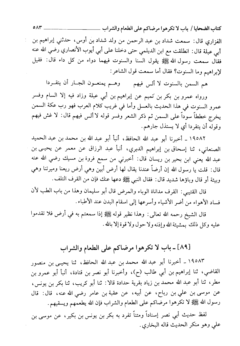19583 - أَخْبَرَنَا أَبُو عَبْدِ اللهِ مُحَمَّدُ بْنُ عَبْدِ اللهِ الْحَافِظُ , ثنا يَحْيَى بْنُ مَنْصُورٍ الْقَاضِي، ثنا إِبْرَاهِيمُ بْنُ أَبِي طَالِبٍ، ح , وَأَخْبَرَنَا أَبُو نَصْرِ بْنُ قَتَادَةَ، أنبأ أَبُو عَمْرِو بْنُ مَطَرٍ، ثنا أَبُو عَبْدِ اللهِ مُحَمَّدُ بْنُ زِيَادٍ بِقَرْيَةِ حَدَادَةَ قَالَا: ثنا أَبُو كُرَيْبٍ، ثنا بَكْرُ بْنُ يُونُسَ، عَنْ مُوسَى بْنِ عَلِيِّ بْنِ رَبَاحٍ، عَنْ أَبِيهِ، عَنْ عُقْبَةَ بْنِ عَامِرٍ رَضِيَ اللهُ عَنْهُ قَالَ: قَالَ رَسُولُ اللهِ صَلَّى اللهُ عَلَيْهِ وَسَلَّمَ: §" لَا تُكْرِهُوا مَرْضَاكُمْ عَلَى الطَّعَامِ وَالشَّرَابِ , فَإِنَّ اللهَ يُطْعِمُهُمْ وَيَسْقِيهِمْ ". لَفْظُ حَدِيثِ أَبِي نَصْرٍ إِسْنَادًا وَمَتْنًا , تَفَرَّدَ بِهِ بَكْرُ بْنُ يُونُسَ بْنِ بُكَيْرٍ , عَنْ مُوسَى بْنِ عَلِيٍّ وَهُوَ مُنْكَرُ الْحَدِيثِ. قَالَهُ الْبُخَارِيُّ. -[584]- وَرَوَاهُ عَلِيُّ بْنُ قُتَيْبَةَ الرِّفَاعِيُّ , وَمُحَمَّدُ بْنُ الْوَلِيدِ الْيَشْكُرِيُّ , عَنْ مَالِكٍ , عَنْ نَافِعٍ , عَنِ ابْنِ عُمَرَ رَضِيَ اللهُ عَنْهُمَا مَرْفُوعًا , وَهُوَ بَاطِلٌ لَا أَصْلَ لَهُ مِنْ حَدِيثِ مَالِكٍ