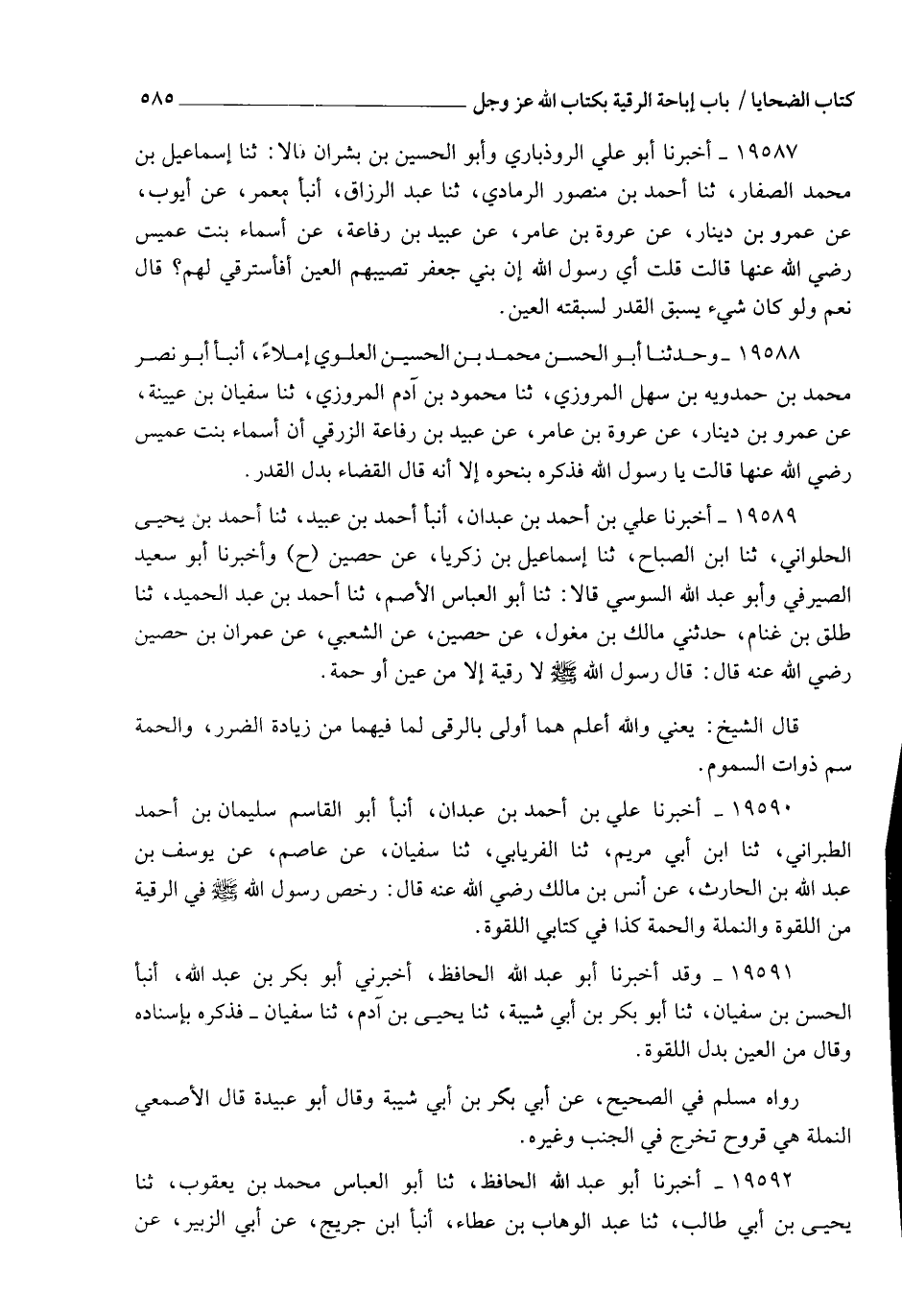 19589 - أَخْبَرَنَا عَلِيُّ بْنُ أَحْمَدَ بْنِ عَبْدَانَ، أنبأ أَحْمَدُ بْنُ عُبَيْدٍ، ثنا أَحْمَدُ بْنُ يَحْيَى الْحُلْوَانِيُّ، ثنا ابْنُ الصَّبَّاحِ، ثنا إِسْمَاعِيلُ بْنُ زَكَرِيَّا، عَنْ حُصَيْنٍ، ح , وَأَخْبَرَنَا أَبُو سَعِيدٍ الصَّيْرَفِيُّ، وَأَبُو عَبْدِ اللهِ السُّوسِيُّ قَالَا: ثنا أَبُو الْعَبَّاسِ الْأَصَمُّ، ثنا أَحْمَدُ بْنُ عَبْدِ الْحَمِيدِ، ثنا طَلْقُ بْنُ غَنَّامٍ، حَدَّثَنِي مَالِكُ بْنُ مِغْوَلٍ، عَنْ حُصَيْنٍ، عَنِ الشَّعْبِيِّ، عَنْ عِمْرَانَ بْنِ حُصَيْنٍ رَضِيَ اللهُ عَنْهُ قَالَ: قَالَ رَسُولُ اللهِ صَلَّى اللهُ عَلَيْهِ وَسَلَّمَ: " §لَا رُقْيَةَ إِلَّا مِنْ عَيْنٍ أَوْ حُمَةٍ". قَالَ الشَّيْخُ: يَعْنِي وَاللهُ أَعْلَمُ هُمَا أَوْلَى بِالرُّقَى؛ لِمَا فِيهِمَا مِنْ زِيَادَةِ الضَّرَرِ , وَالْحُمَةُ سُمُّ ذَوَاتِ السُّمُومِ