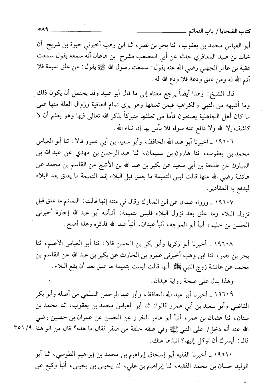 19607 - وَرَوَاهُ عَبْدَانُ عَنِ ابْنِ الْمُبَارَكِ، وَقَالَ فِي مَتْنِهِ: إِنَّهَا قَالَتْ: التَّمَائِمُ مَا عُلِّقَ قَبْلَ نُزُولِ الْبَلَاءِ , وَمَا عُلِّقَ بَعْدَ نُزُولِ الْبَلَاءِ فَلَيْسَ بِتَمِيمَةٍ. أَنْبَأَنِيهِ أَبُو عَبْدِ اللهِ إِجَازَةً , أَخْبَرَنِي الْحَسَنُ بْنُ حَلِيمٍ , أَنْبَأَ أَبُو الْمُوَجِّهِ , أَنْبَأَ عَبْدَانُ , أَنْبَأَ عَبْدُ اللهِ فَذَكَرَهُ , وَهَذَا أَصَحُّ