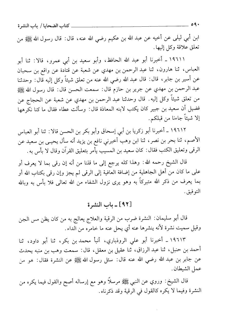 19613 - أَخْبَرَنَا أَبُو عَلِيٍّ الرُّوذْبَارِيُّ، أنبأ مُحَمَّدُ بْنُ بَكْرٍ، ثنا أَبُو دَاوُدَ، ثنا أَحْمَدُ بْنُ حَنْبَلٍ، ثنا عَبْدُ الرَّزَّاقِ، ثنا عَقِيلُ بْنُ مَعْقِلٍ، قَالَ: سَمِعْتُ وَهْبَ بْنَ مُنَبِّهٍ يُحَدِّثُ عَنْ جَابِرِ بْنِ عَبْدِ اللهِ رَضِيَ اللهُ عَنْهُ قَالَ: سُئِلَ رَسُولُ اللهِ صَلَّى اللهُ عَلَيْهِ وَسَلَّمَ §عَنِ النُّشْرَةِ، فَقَالَ: " هُوَ مِنْ عَمَلِ الشَّيْطَانِ ". قَالَ الشَّيْخُ: وَرُوِيَ عَنِ النَّبِيِّ صَلَّى اللهُ عَلَيْهِ وَسَلَّمَ مُرْسَلًا , وَهُوَ مَعَ إِرْسَالِهِ أَصَحُّ , وَالْقَوْلُ فِيمَا يُكْرَهُ مِنَ النُّشْرَةِ وَفِيمَا لَا يُكْرَهُ كَالْقَوْلِ فِي الرُّقْيَةِ، وَقَدْ ذَكَرْنَاهُ
