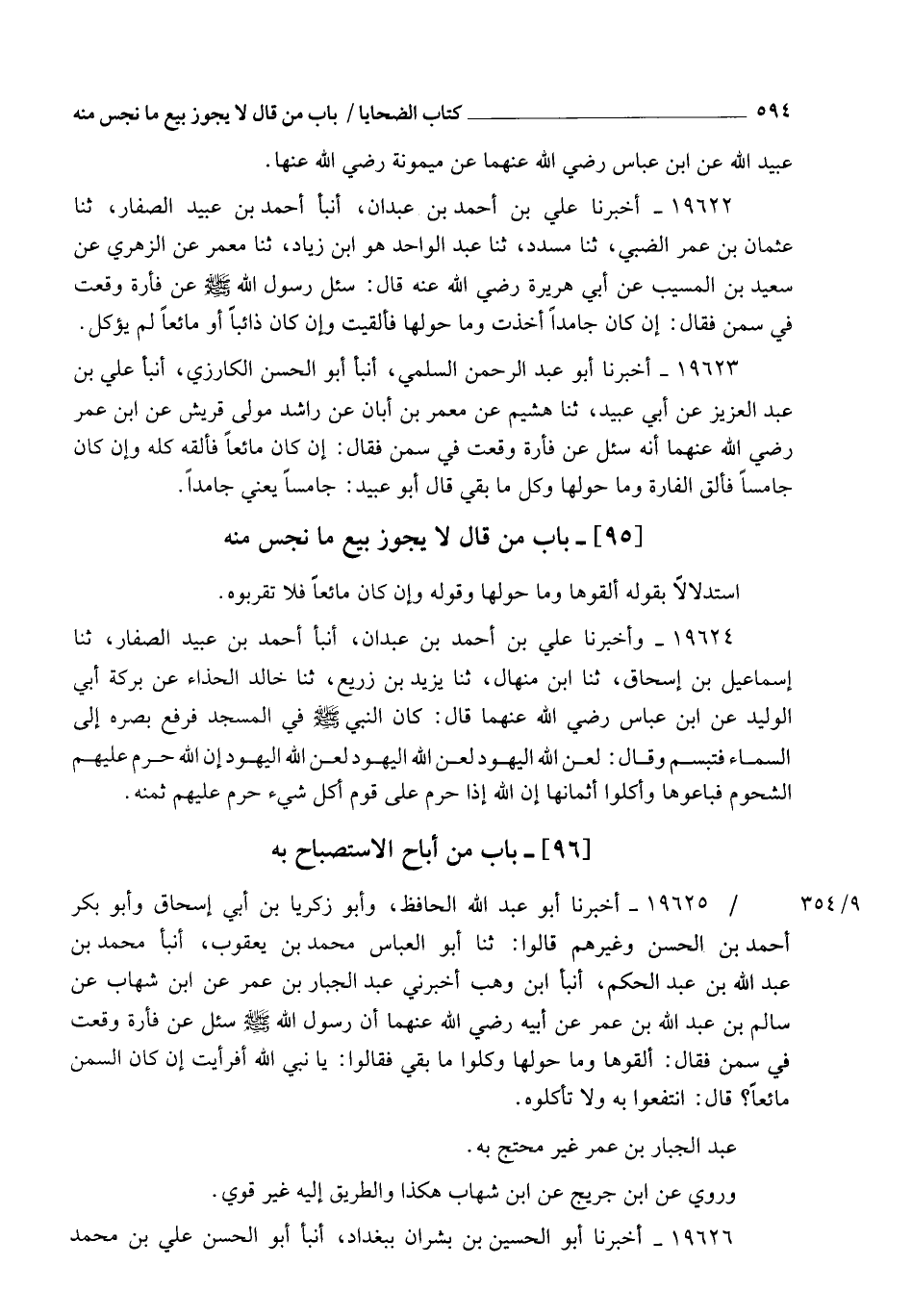 19626 - أَخْبَرَنَا أَبُو الْحُسَيْنِ بْنُ بِشْرَانَ بِبَغْدَادَ , أنبأ أَبُو الْحَسَنِ عَلِيُّ بْنُ مُحَمَّدٍ -[595]- الْمِصْرِيُّ , ثنا بَكْرُ بْنُ سَهْلٍ، ثنا شُعَيْبُ بْنُ يَحْيَى، ثنا يَحْيَى بْنُ أَيُّوبَ، عَنِ ابْنِ جُرَيْجٍ، عَنِ ابْنِ شِهَابٍ، عَنْ سَالِمِ بْنِ عَبْدِ اللهِ، عَنِ ابْنِ عُمَرَ رَضِيَ اللهُ عَنْهُمَا قَالَ: سُئِلَ رَسُولُ اللهِ صَلَّى اللهُ عَلَيْهِ وَسَلَّمَ عَنِ الْفَأْرَةِ تَقَعُ فِي السَّمْنِ أَوِ الْوَدَكِ فَقَالَ: " §اطْرَحُوهَا وَمَا حَوْلَهَا إِنْ كَانَ جَامِدًا ". فَقَالُوا: يَا رَسُولَ اللهِ فَإِنْ كَانَ مَائِعًا؟ قَالَ: " فَانْتَفِعُوا بِهِ وَلَا تَأْكُلُوهُ ". وَالصَّحِيحُ عَنِ ابْنِ عُمَرَ مِنْ قَوْلِهِ مَوْقُوفٌ عَلَيْهِ غَيْرُ مَرْفُوعٍ