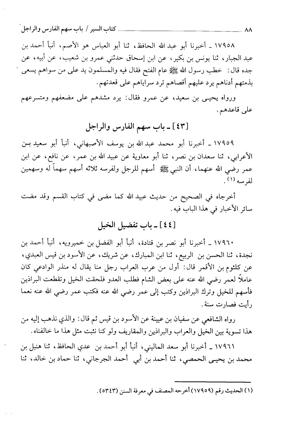 17959 - أَخْبَرَنَا أَبُو مُحَمَّدٍ عَبْدُ اللهِ بْنُ يُوسُفَ الْأَصْبَهَانِيُّ، أنبأ أَبُو سَعِيدِ بْنُ الْأَعْرَابِيِّ، ثنا سَعْدَانُ بْنُ نَصْرٍ، ثنا أَبُو مُعَاوِيَةَ، عَنْ عُبَيْدِ اللهِ بْنِ عُمَرَ، عَنْ نَافِعٍ، عَنِ ابْنِ عُمَرَ رَضِيَ اللهُ عَنْهُمَا، أَنَّ النَّبِيَّ صَلَّى اللهُ عَلَيْهِ وَسَلَّمَ" §أَسْهَمَ لِلرَّجُلِ وَلِفَرَسِهِ ثَلَاثَةَ أَسْهُمٍ: سَهْمًا لَهُ، وَسَهْمَيْنِ لِفَرَسِهِ". أَخْرَجَاهُ فِي الصَّحِيحِ مِنْ حَدِيثِ عُبَيْدِ اللهِ كَمَا مَضَى فِي كِتَابِ الْقَسْمِ، وَقَدْ مَضَتْ سَائِرُ الْأَخْبَارِ فِي هَذَا الْبَابِ فِيهِ