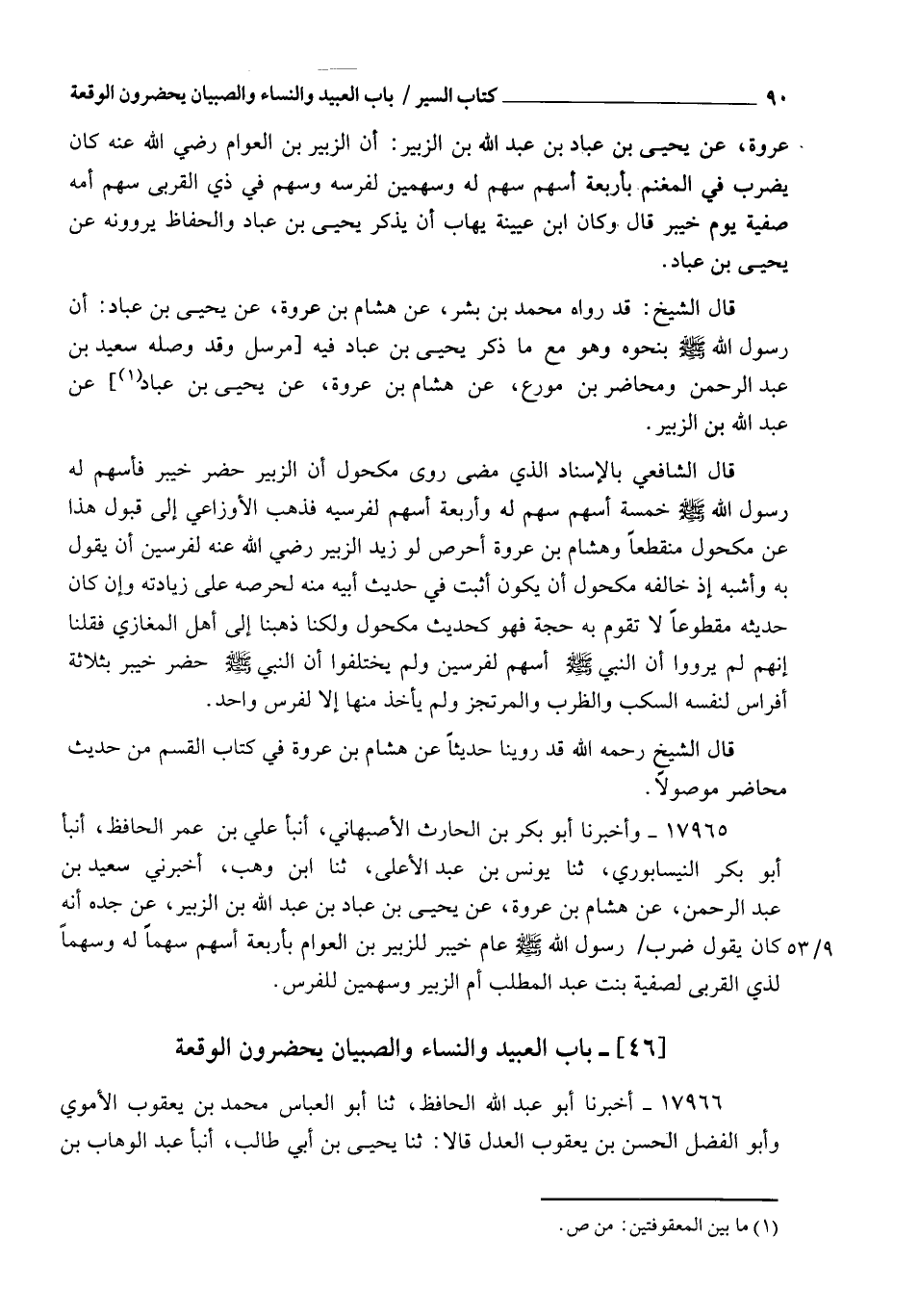 17965 - وَأَخْبَرَنَا أَبُو بَكْرِ بْنُ الْحَارِثِ الْأَصْبَهَانِيُّ، أنبأ عَلِيُّ بْنُ عُمَرَ الْحَافِظُ، أنبأ أَبُو بَكْرٍ النَّيْسَابُورِيُّ، ثنا يُونُسُ بْنُ عَبْدِ الْأَعْلَى، ثنا ابْنُ وَهْبٍ، أَخْبَرَنِي سَعِيدُ بْنُ عَبْدِ الرَّحْمَنِ، عَنْ هِشَامِ بْنِ عُرْوَةَ، عَنْ يَحْيَى بْنِ عَبَّادِ بْنِ عَبْدِ اللهِ بْنِ الزُّبَيْرِ، عَنْ جَدِّهِ، أَنَّهُ كَانَ يَقُولُ: §ضَرَبَ رَسُولُ اللهِ صَلَّى اللهُ عَلَيْهِ وَسَلَّمَ عَامَ خَيْبَرَ لِلزُّبَيْرِ بْنِ الْعَوَّامِ بِأَرْبَعَةِ أَسْهُمٍ: سَهْمًا لَهُ، وَسَهْمًا لِذِي الْقُرْبَى لِصَفِيَّةَ بِنْتِ عَبْدِ الْمُطَّلِبِ أُمِّ الزُّبَيْرِ، وَسَهْمَيْنِ لِلْفَرَسِ "