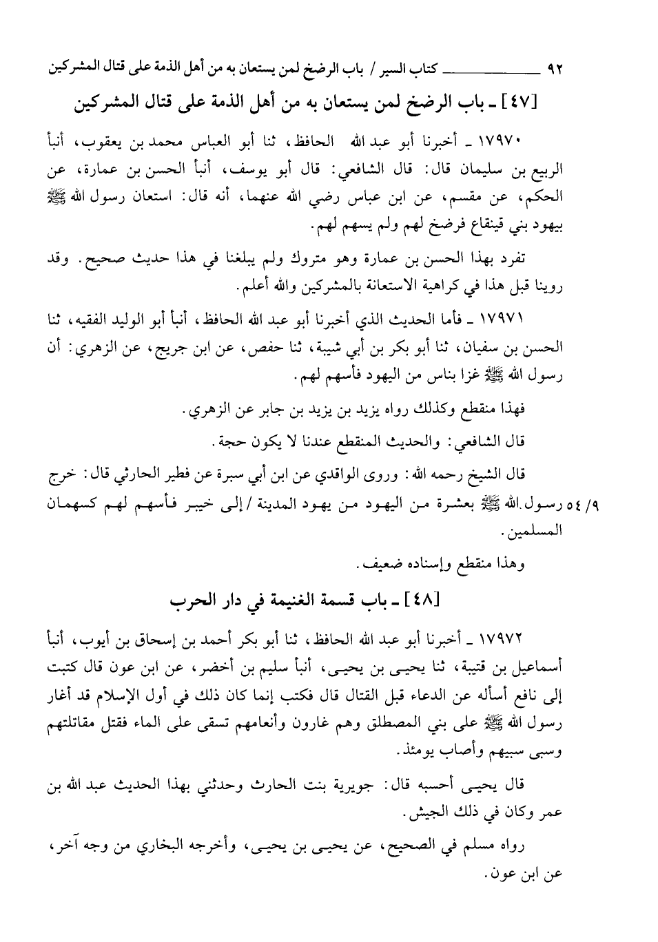 17971 - فَأَمَّا الْحَدِيثُ الَّذِي أَخْبَرَنَا أَبُو عَبْدِ اللهِ الْحَافِظُ، أنبأ أَبُو الْوَلِيدِ الْفَقِيهُ، ثنا الْحَسَنُ بْنُ سُفْيَانَ، ثنا أَبُو بَكْرِ بْنُ أَبِي شَيْبَةَ، ثنا حَفْصٌ، عَنِ ابْنِ جُرَيْجٍ، عَنِ الزُّهَرِيِّ، أَنَّ رَسُولَ اللهِ صَلَّى اللهُ عَلَيْهِ وَسَلَّمَ §" غَزَا بِنَاسٍ مِنَ الْيَهُودِ فَأَسْهَمَ لَهُمْ ". " فَهَذَا مُنْقَطِعٌ، وَكَذَلِكَ رَوَاهُ يَزِيدُ بْنُ يَزِيدَ بْنِ جَابِرٍ، عَنِ الزُّهْرِيِّ " قَالَ الشَّافِعِيُّ: " وَالْحَدِيثُ الْمُنْقَطِعُ عِنْدَنَا لَا يَكُونُ حُجَّةً. قَالَ الشَّيْخُ رَحِمَهُ اللهُ: وَرَوَى الْوَاقِدِيُّ، عَنِ ابْنِ أَبِي سَبْرَةَ، عَنْ فُطَيْرٍ الْحَارِثِيِّ، قَالَ: " خَرَجَ رَسُولُ اللهِ صَلَّى اللهُ عَلَيْهِ وَسَلَّمَ بِعَشَرَةٍ مِنَ الْيَهُودِ مِنْ يَهُودِ الْمَدِينَةِ إِلَى خَيْبَرَ فَأَسْهَمَ لَهُمْ كَسُهْمَانِ الْمُسْلِمِينَ ". وَهَذَا مُنْقَطِعٌ وَإِسْنَادُهُ ضَعِيفٌ