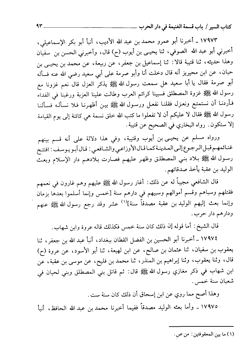 17973 - أَخْبَرَنَا أَبُو عَمْرٍو مُحَمَّدُ بْنُ عَبْدِ اللهِ الْأَدِيبُ، أنبأ أَبُو بَكْرٍ الْإِسْمَاعِيلِيُّ، أَخْبَرَنِي أَبُو عَبْدِ اللهِ الصُّوفِيُّ، ثنا يَحْيَى بْنُ أَيُّوبَ، ح، قَالَ: وَأَخْبَرَنِي الْحَسَنُ بْنُ سُفْيَانَ وَهَذَا حَدِيثُهُ، ثنا قُتَيْبَةُ، قَالَا: ثنا إِسْمَاعِيلُ بْنُ جَعْفَرَ، عَنْ رَبِيعَةَ، عَنْ مُحَمَّدِ بْنِ يَحْيَى بْنِ حَبَّانَ، عَنِ ابْنِ مُحَيْرِيزٍ، أَنَّهُ قَالَ: دَخَلْتُ أَنَا وَأَبُو صِرْمَةَ عَلَى أَبِي سَعِيدٍ رَضِيَ اللهُ عَنْهُ، فَسَأَلَهُ أَبُو صِرْمَةُ، فَقَالَ: يَا أَبَا سَعِيدٍ هَلْ سَمِعْتَ رَسُولَ اللهِ صَلَّى اللهُ عَلَيْهِ وَسَلَّمَ يَذْكُرُ الْعَزْلَ؟ قَالَ: نَعَمْ غَزَوْنَا مَعَ رَسُولِ اللهِ صَلَّى اللهُ عَلَيْهِ وَسَلَّمَ غَزْوَةَ الْمُصْطَلِقِ فَسَبَيْنَا كَرَائِمَ الْعَرَبِ وَطَالَتْ عَلَيْنَا الْعُزْبَةُ وَرَغِبْنَا فِي الْفِدَاءِ، فَأَرَدْنَا أَنْ نَسْتَمْتِعَ وَنَعْزِلَ، فَقُلْنَا نَفْعَلُ وَرَسُولُ اللهِ صَلَّى اللهُ عَلَيْهِ وَسَلَّمَ بَيْنَ أَظْهُرِنَا فَلَا نَسْأَلُهُ، فَسَأَلْنَا رَسُولُ اللهِ صَلَّى اللهُ عَلَيْهِ وَسَلَّمَ فَقَالَ: " §لَا عَلَيْكُمْ أَنْ لَا تَفْعَلُوا، مَا كَتَبَ اللهُ خَلْقَ نَسَمَةٍ هِيَ كَائِنَةٌ إِلَى يَوْمِ الْقِيَامَةِ إِلَّا سَتَكُونُ " رَوَاهُ الْبُخَارِيُّ فِي الصَّحِيحِ عَنْ قُتَيْبَةَ، وَرَوَاهُ مُسْلِمٌ عَنْ يَحْيَى بْنِ أَيُّوبَ، وَقُتَيْبَةَ، وَفِي هَذَا دَلَالَةٌ عَلَى أَنَّهُ قَسَّمَ بَيْنَهُمْ غَنَائِمَهُمْ قَبْلَ الرُّجُوعِ إِلَى الْمَدِينَةِ، كَمَا قَالَ الْأَوْزَاعِيُّ، وَالشَّافِعِيُّ: قَالَ أَبُو يُوسُفَ: افْتَتَحَ رَسُولُ اللهِ صَلَّى اللهُ عَلَيْهِ وَسَلَّمَ بِلَادَ بَنِي الْمُصْطَلِقِ وَظَهَرَ عَلَيْهِمْ، فَصَارَتْ بِلَادُهُمْ دَارَ الْإِسْلَامِ، وَبَعَثَ الْوَلِيدَ بْنَ عُقْبَةَ يَأْخُذُ صَدَقَاتِهِمْ. قَالَ الشَّافِعِيُّ مُجِيبًا لَهُ عَنْ ذَلِكَ: " أَغَارَ رَسُولُ اللهِ صَلَّى اللهُ عَلَيْهِ وَسَلَّمَ عَلَيْهِمْ وَهُمْ غَارُّونَ فِي نِعَمِهِمْ، فَقَتَلَهُمْ وَسَبَاهُمْ، وَقَسَمَ أَمْوَالَهُمْ وَسَبْيَهُمْ فِي دَارِهِمْ سَنَةَ خَمْسٍ، وَإِنَّمَا أَسْلَمُوا بَعْدَهَا بِزَمَانٍ، وَإِنَّمَا بَعَثَ إِلَيْهِمُ الْوَلِيدَ بْنَ عُقْبَةَ مُصَدِّقًا سَنَةَ عَشْرٍ، وَقَدْ رَجَعَ رَسُولُ اللهِ صَلَّى اللهُ عَلَيْهِ وَسَلَّمَ عَنْهُمْ، وَدَارُهُمْ دَارُ حَرْبٍ ". قَالَ الشَّيْخُ: أَمَّا قَوْلُهُ: " إِنَّ ذَلِكَ كَانَ سَنَةَ خَمْسٍ فَكَذَلِكَ قَالَهُ عُرْوَةُ، وَابْنُ شِهَابٍ "