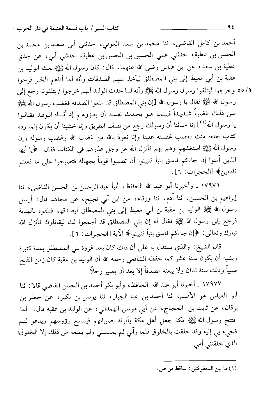 17976 - وَأَخْبَرَنَا أَبُو عَبْدِ اللهِ الْحَافِظُ، أنبأ عَبْدُ الرَّحْمَنِ بْنُ الْحَسَنِ الْقَاضِي، ثنا إِبْرَاهِيمُ بْنُ الْحُسَيْنِ، ثنا آدَمُ، ثنا وَرْقَاءُ، عَنِ ابْنِ أَبِي نَجِيحٍ، عَنْ مُجَاهِدٍ، قَالَ: §" أَرْسَلَ رَسُولُ اللهِ صَلَّى اللهُ عَلَيْهِ وَسَلَّمَ الْوَلِيدَ بْنَ عُقْبَةَ بْنِ أَبِي مُعَيْطٍ إِلَى بَنِي الْمُصْطَلِقِ لِيُصَدِّقَهُمْ، فَتَلَقَّوْهُ بِالْهَدِيَّةِ، فَرَجَعَ إِلَى رَسُولِ اللهِ صَلَّى اللهُ عَلَيْهِ وَسَلَّمَ، فَقَالَ لَهُ: إِنَّ بَنِي الْمُصْطَلِقِ قَدْ أَجْمَعُوا لَكَ لِيُقَاتِلُوكَ. فَأَنْزَلَ اللهُ تَبَارَكَ وَتَعَالَى: {إِنْ جَاءَكُمْ فَاسِقٌ بِنَبَأٍ فَتَبَيَّنُوا} [الحجرات: 6] الْآيَةَ. قَالَ الشَّيْخُ: " وَالَّذِي يُسْتَدَلُّ بِهِ عَلَى أَنَّ ذَلِكَ كَانَ بَعْدَ غَزْوَةِ بَنِي الْمُصْطَلِقِ بِمُدَّةٍ كَثِيرَةٍ وَيُشْبِهُ أَنْ يَكُونَ سَنَةَ عَشْرٍ، كَمَا حَفِظَهُ الشَّافِعِيُّ رَحِمَهُ اللهُ، أَنَّ الْوَلِيدَ بْنَ عُقْبَةَ كَانَ زَمَنَ الْفَتْحِ صَبِيًّا، وَذَلِكَ سَنَةَ ثَمَانٍ، وَلَا يَبْعَثُهُ مُصَدِّقًا إِلَّا بَعْدَ أَنْ يَصِيرَ رَجُلًا "