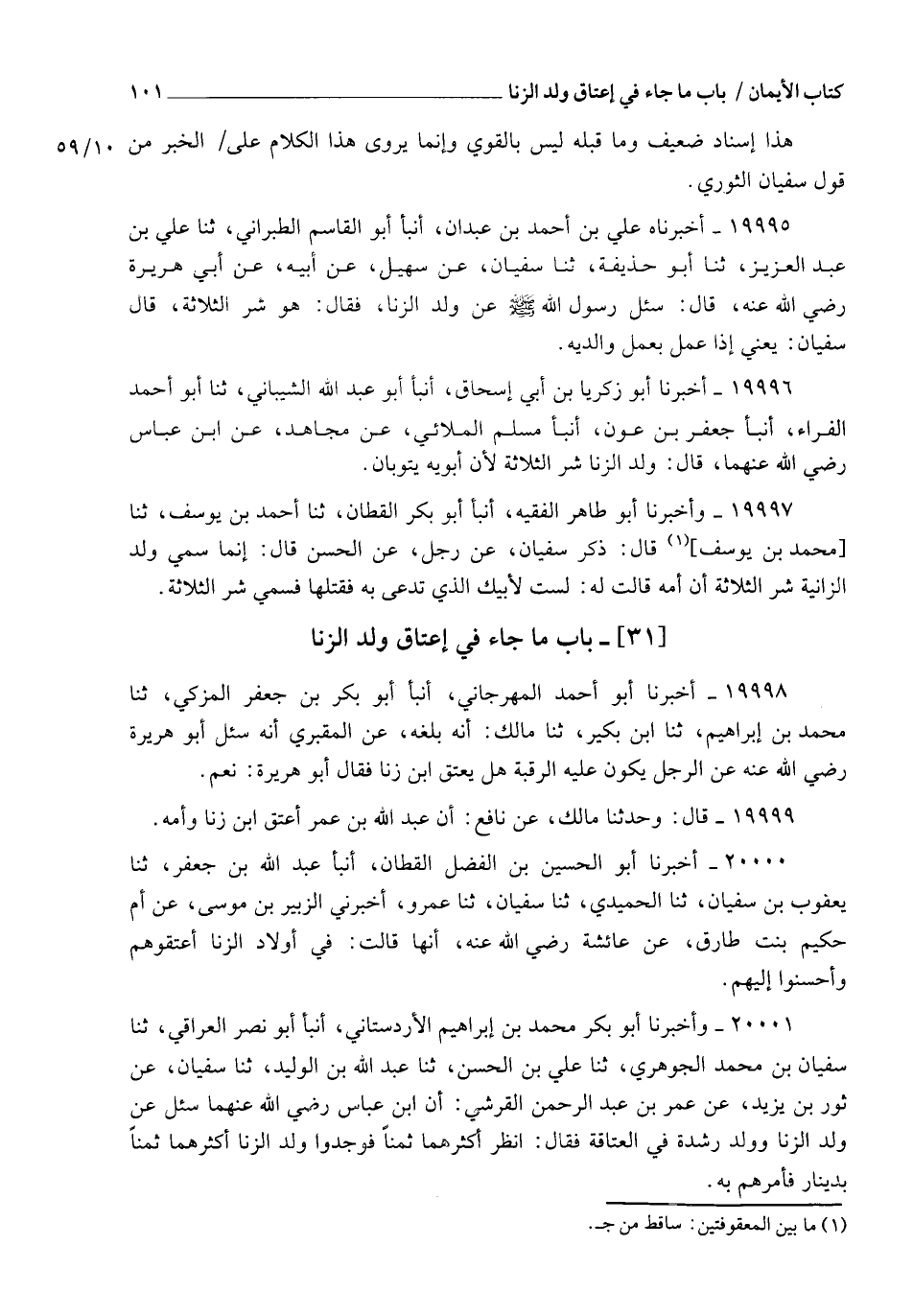 20001 - وَأَخْبَرَنَا أَبُو بَكْرٍ مُحَمَّدُ بْنُ إِبْرَاهِيمَ الْأَرْدَسْتَانِيُّ , أنبأ أَبُو نَصْرٍ الْعِرَاقِيُّ , ثنا سُفْيَانُ بْنُ مُحَمَّدٍ الْجَوْهَرِيُّ , ثنا عَلِيُّ بْنُ الْحَسَنِ , ثنا عَبْدُ اللهِ بْنُ الْوَلِيدِ , ثنا سُفْيَانُ , عَنْ ثَوْرِ بْنِ يَزِيدَ , عَنْ عُمَرَ بْنِ عَبْدِ الرَّحْمَنِ الْقُرَشِيِّ أَنَّ ابْنَ عَبَّاسٍ رَضِيَ اللهُ عَنْهُمَا §سُئِلَ عَنْ وَلَدِ الزِّنَا , وَوَلَدِ رِشْدَةٍ فِي الْعِتَاقَةِ؟ فَقَالَ: " انْظُرْ أَكْثَرَهُمَا ثَمَنًا " , فَوَجَدُوا وَلَدَ الزِّنَا أَكْثَرَهُمَا ثَمَنًا بِدِينَارٍ , فَأَمَرَهُمْ بِهِ "
