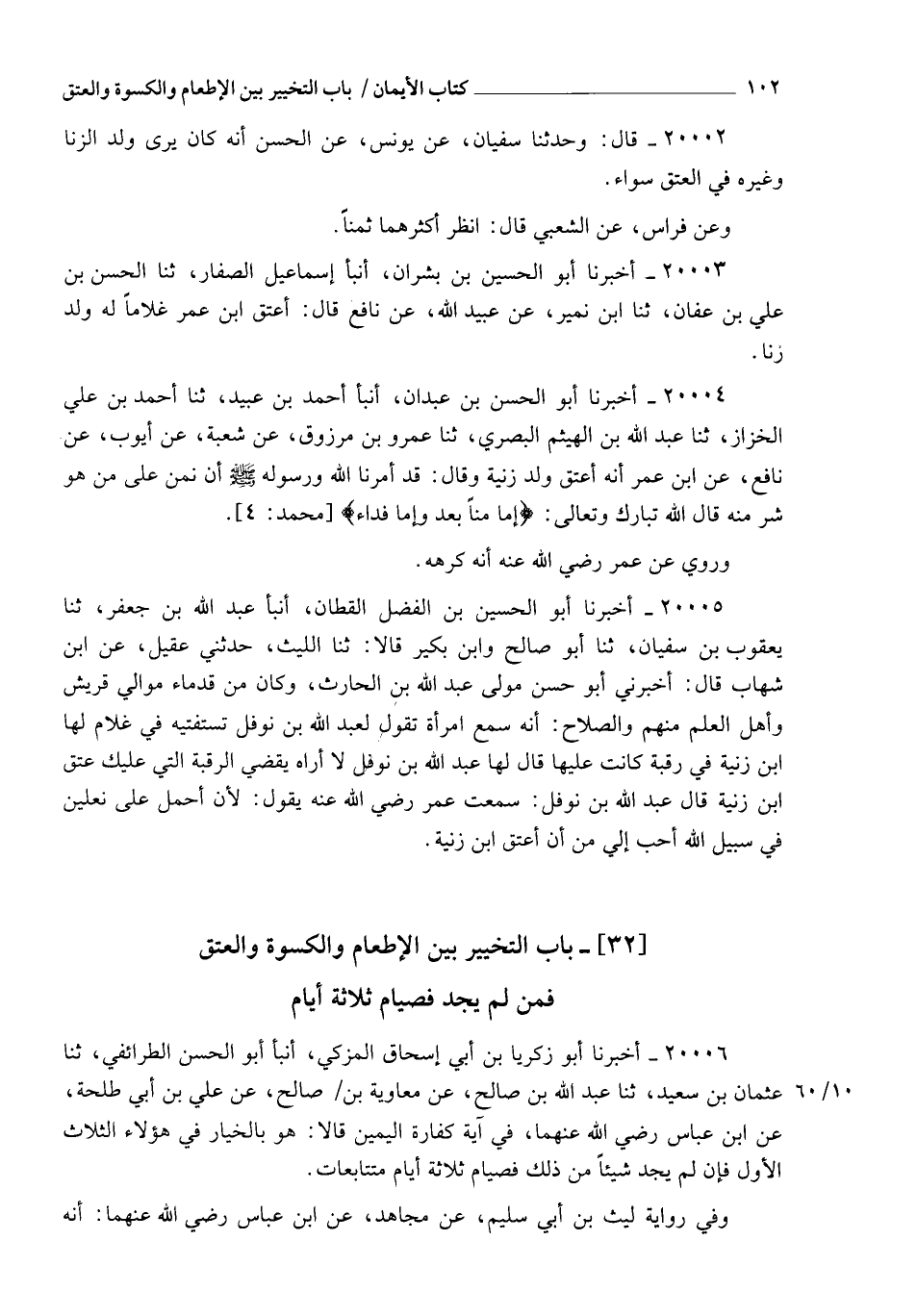 20003 - أَخْبَرَنَا أَبُو الْحُسَيْنِ بْنُ بِشْرَانَ , أنبأ إِسْمَاعِيلُ الصَّفَّارُ , ثنا الْحَسَنُ بْنُ عَلِيِّ بْنِ عَفَّانَ , ثنا ابْنُ نُمَيْرٍ , عَنْ عُبَيْدِ اللهِ , عَنْ نَافِعٍ قَالَ: §" أَعْتَقَ ابْنُ عُمَرَ غُلَامًا لَهُ , وَلَدَ زِنًا "