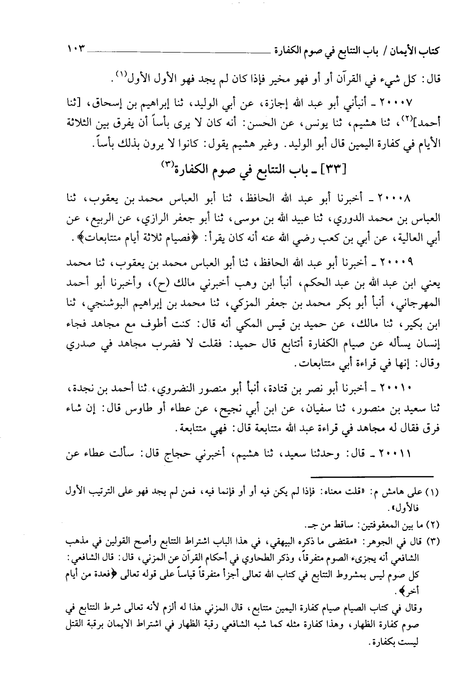 20007 - أَنْبَأَنِي أَبُو عَبْدِ اللهِ إِجَازَةً عَنْ أَبِي الْوَلِيدِ , ثنا إِبْرَاهِيمُ بْنُ إِسْحَاقَ , ثنا أَحْمَدُ , ثنا هُشَيْمٌ , ثنا يُونُسُ , عَنِ الْحَسَنِ أَنَّهُ §" كَانَ لَا يَرَى بَأْسًا أَنْ يُفَرَّقَ بَيْنَ الثَّلَاثَةِ الْأَيَّامِ فِي كَفَّارَةِ الْيَمِينِ ". قَالَ أَبُو الْوَلِيدِ: وَغَيْرُ هُشَيْمٍ يَقُولُ: " كَانُوا لَا يَرَوْنَ بِذَلِكَ بَأْسًا "