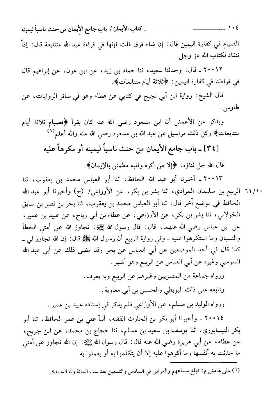 20013 - أَخْبَرَنَا أَبُو عَبْدِ اللهِ الْحَافِظُ , ثنا أَبُو الْعَبَّاسِ مُحَمَّدُ بْنُ يَعْقُوبَ , ثنا الرَّبِيعُ بْنُ سُلَيْمَانَ الْمُرَادِيُّ , ثنا بِشْرُ بْنُ بَكْرٍ , عَنِ الْأَوْزَاعِيِّ ح , وَأَخْبَرَنَا أَبُو عَبْدِ اللهِ الْحَافِظُ فِي مَوْضِعٍ آخَرَ قَالَ: ثنا أَبُو الْعَبَّاسِ مُحَمَّدُ بْنُ يَعْقُوبَ , ثنا بَحْرُ بْنُ نَصْرِ بْنِ سَابِقٍ الْخَوْلَانِيُّ , ثنا بِشْرُ بْنُ بَكْرٍ , عَنِ الْأَوْزَاعِيِّ , عَنْ عَطَاءِ بْنِ أَبِي رَبَاحٍ , عَنْ عُبَيْدِ بْنِ عُمَيْرٍ , عَنِ ابْنِ عَبَّاسٍ رَضِيَ اللهُ عَنْهُمَا قَالَ: قَالَ رَسُولُ اللهِ صَلَّى اللهُ عَلَيْهِ وَسَلَّمَ: §" تَجَاوَزَ اللهُ عَنْ أُمَّتِي الْخَطَأَ وَالنِّسْيَانَ , وَمَا اسْتُكْرِهُوا عَلَيْهِ ". وَفِي رِوَايَةِ الرَّبِيعِ أَنَّ رَسُولَ اللهِ صَلَّى اللهُ عَلَيْهِ وَسَلَّمَ قَالَ: " إِنَّ اللهَ تَجَاوَزَ لِي كَذَا " قَالَ فِي أَحَدِ الْمَوْضِعَيْنِ , عَنْ أَبِي الْعَبَّاسِ عَنْ بَحْرٍ. وَقَدْ مَضَى ذَلِكَ عَنْ أَبِي عَبْدِ اللهِ السُّوسِيِّ وَغَيْرِهِ , عَنْ أَبِي الْعَبَّاسِ عَنِ الرَّبِيعِ وَهُوَ أَشْهُرُ , وَرَوَاهُ جَمَاعَةٌ مِنَ الْمِصْرِيِّينَ وَغَيْرُهُمْ , عَنِ الرَّبِيعِ , وَبِهِ يُعْرَفُ , وَتَابَعَهُ عَلَى ذَلِكَ الْبُوَيْطِيُّ وَالْحُسَيْنُ بْنُ أَبِي مُعَاوِيَةَ وَرَوَاهُ الْوَلِيدُ بْنُ مُسْلِمٍ عَنِ الْأَوْزَاعِيِّ فَلَمْ يَذْكُرْ فِي إِسْنَادِهِ عُبَيْدَ بْنَ عُمَيْرٍ
