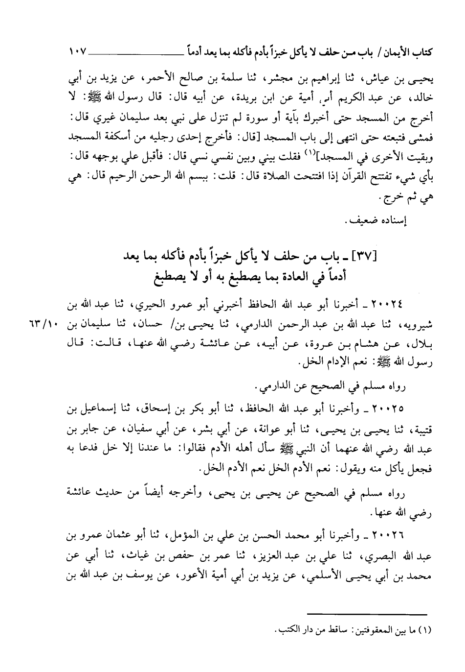 20026 - وَأَخْبَرَنَا أَبُو مُحَمَّدٍ الْحَسَنُ بْنُ عَلِيِّ بْنِ الْمُؤَمَّلِ , ثنا أَبُو عُثْمَانَ عَمْرُو بْنُ عَبْدِ اللهِ الْبَصْرِيُّ , ثنا عَلِيُّ بْنُ عَبْدِ الْعَزِيزِ , ثنا عُمَرُ بْنُ حَفْصِ بْنِ غِيَاثٍ , ثنا أَبِي , عَنْ مُحَمَّدِ بْنِ أَبِي يَحْيَى الْأَسْلَمِيِّ , عَنْ يَزِيدَ بْنِ أَبِي أُمَيَّةَ الْأَعْوَرِ , عَنْ يُوسُفَ بْنِ عَبْدِ اللهِ بْنِ -[108]- سَلَّامٍ قَالَ: §رَأَيْتُ النَّبِيَّ صَلَّى اللهُ عَلَيْهِ وَسَلَّمَ أَخَذَ كِسْرَةً مِنْ خُبْزِ شَعِيرٍ , فَوَضَعَ عَلَيْهَا تَمْرَةً , وَقَالَ: " هَذِهِ إِدَامُ هَذِهِ " , فَأَكَلَهَا