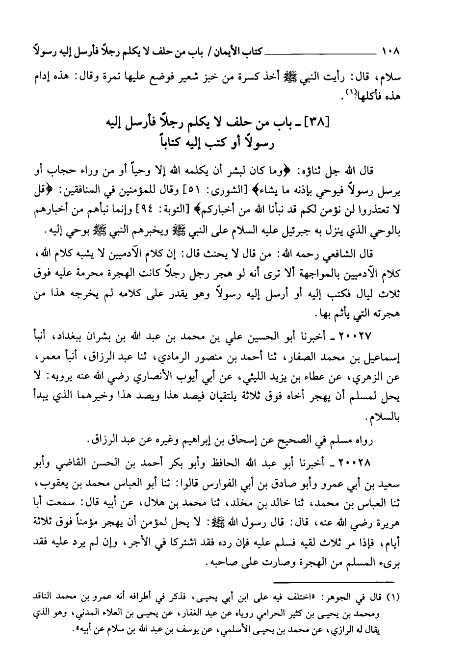 20027 - أَخْبَرَنَا أَبُو الْحُسَيْنِ عَلِيُّ بْنُ مُحَمَّدِ بْنِ عَبْدِ اللهِ بْنِ بِشْرَانَ بِبَغْدَادَ أنبأ إِسْمَاعِيلُ بْنُ مُحَمَّدٍ الصَّفَّارُ , ثنا أَحْمَدُ بْنُ مَنْصُورٍ الرَّمَادِيُّ , ثنا عَبْدُ الرَّزَّاقِ , أنبأ مَعْمَرٌ , عَنِ الزُّهْرِيِّ , عَنْ عَطَاءِ بْنِ يَزِيدَ اللَّيْثِيِّ , عَنْ أَبِي أَيُّوبَ الْأَنْصَارِيِّ رَضِيَ اللهُ عَنْهُ يَرْوِيهِ: §" لَا يَحِلُّ لِمُسْلِمٍ أَنْ يَهْجُرَ أَخَاهُ فَوْقَ ثَلَاثَةٍ , يَلْتَقِيَانِ فَيَصُدُّ هَذَا وَيَصُدُّ هَذَا , وَخَيْرُهُمَا الَّذِي يَبْدَأُ بِالسَّلَامِ " رَوَاهُ مُسْلِمٌ فِي الصَّحِيحِ عَنْ إِسْحَاقَ بْنِ إِبْرَاهِيمَ وَغَيْرِهِ , عَنْ عَبْدِ الرَّزَّاقِ