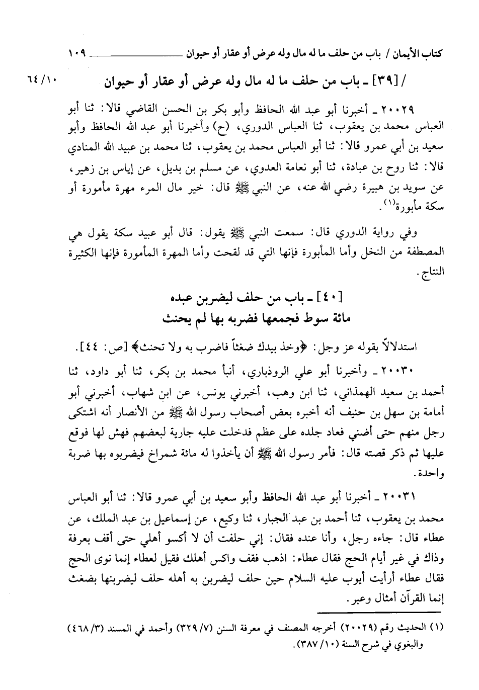 20029 - أَخْبَرَنَا أَبُو عَبْدِ اللهِ الْحَافِظُ وَأَبُو بَكْرِ بْنُ الْحَسَنِ الْقَاضِي قَالَا: ثنا أَبُو الْعَبَّاسِ مُحَمَّدُ بْنُ يَعْقُوبَ , ثنا الْعَبَّاسُ الدُّورِيُّ , ح وَأَخْبَرَنَا أَبُو عَبْدِ اللهِ الْحَافِظُ وَأَبُو سَعِيدِ بْنُ أَبِي عَمْرٍو قَالَا: ثنا أَبُو الْعَبَّاسِ مُحَمَّدُ بْنُ يَعْقُوبَ , ثنا مُحَمَّدُ بْنُ عُبَيْدِ اللهِ الْمُنَادِي قَالَا: ثنا رَوْحُ بْنُ عُبَادَةَ , ثنا أَبُو نَعَامَةَ الْعَدَوِيُّ , عَنْ مُسْلِمِ بْنِ بُدَيْلٍ , عَنْ إِيَاسِ بْنِ زُهَيْرٍ , عَنْ سُوَيْدِ بْنِ هُبَيْرَةَ رَضِيَ اللهُ عَنْهُ , عَنِ النَّبِيِّ صَلَّى اللهُ عَلَيْهِ وَسَلَّمَ قَالَ: §" خَيْرُ مَالِ الْمَرْءِ مُهْرَةٌ مَأْمُورَةٌ , أَوْ سِكَّةٌ مَأْبُورَةٌ ". وَفِي رِوَايَةِ الدُّورِيِّ قَالَ: سَمِعْتُ النَّبِيَّ صَلَّى اللهُ عَلَيْهِ وَسَلَّمَ يَقُولُ: قَالَ أَبُو عُبَيْدٍ: سِكَّةٌ , يَقُولُ هِيَ الْمُصْطَفَّةُ مِنَ النَّخْلِ , وَأَمَّا الْمَأْبُورَةُ , فَإِنَّهَا الَّتِي قَدْ لَقِحَتْ , وَأَمَّا الْمُهْرَةُ الْمَأْمُورَةُ , فَإِنَّهَا الْكَثِيرَةُ النِّتَاجِ "