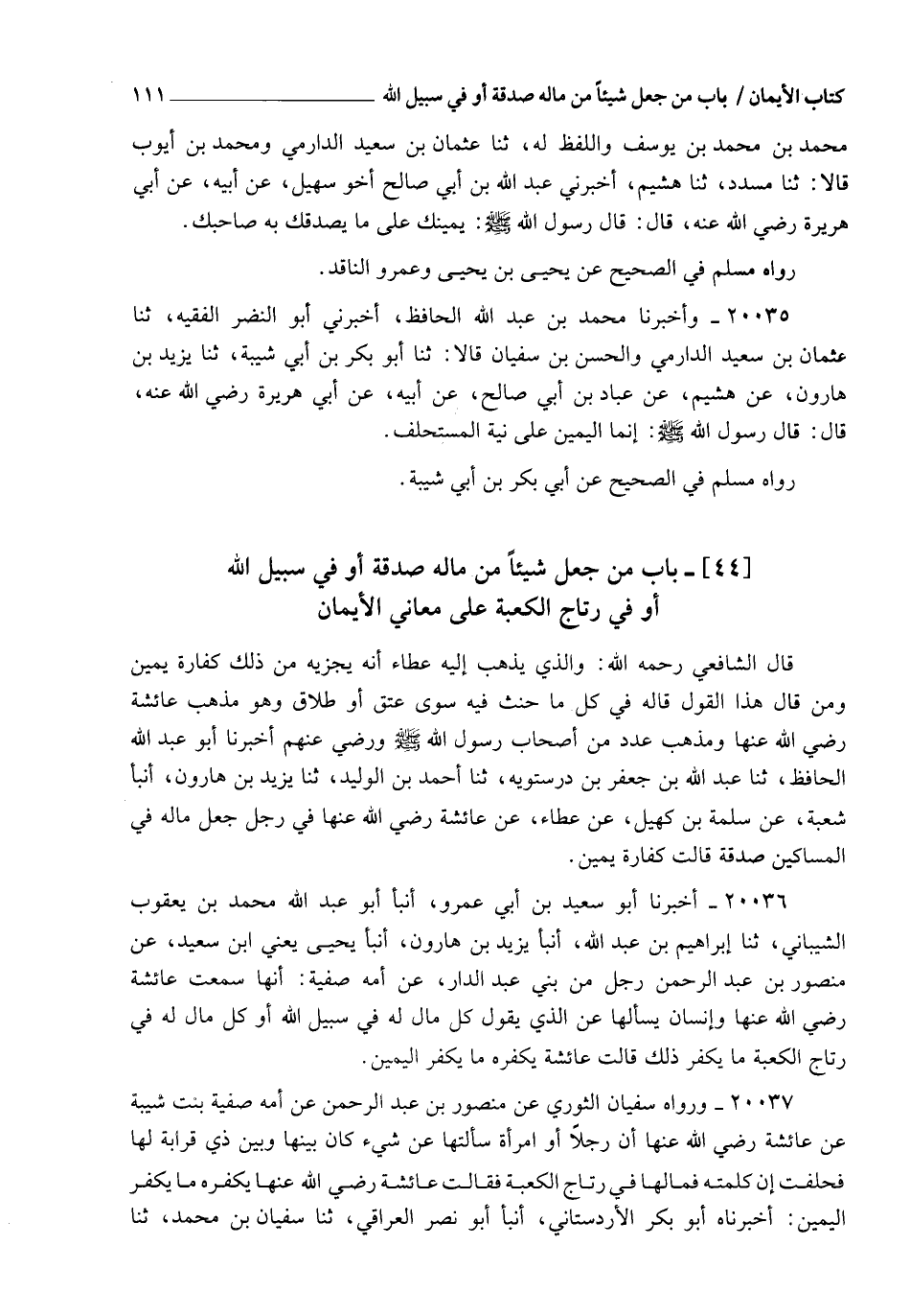 20036 - أَخْبَرَنَا أَبُو سَعِيدِ بْنُ أَبِي عَمْرٍو , أنبأ أَبُو عَبْدِ اللهِ مُحَمَّدُ بْنُ يَعْقُوبَ الشَّيْبَانِيُّ ثنا إِبْرَاهِيمُ بْنُ عَبْدِ اللهِ , أنبأ يَزِيدُ بْنُ هَارُونَ , أنبأ يَحْيَى يَعْنِي ابْنَ سَعِيدٍ , عَنْ مَنْصُورِ بْنِ عَبْدِ الرَّحْمَنِ رَجُلٍ مِنْ بَنِي عَبْدِ الدَّارِ , عَنْ أُمِّهِ صَفِيَّةَ أَنَّهَا §سَمِعَتْ عَائِشَةَ رَضِيَ اللهُ عَنْهَا , وَإِنْسَانٌ يَسْأَلُهَا عَنِ الَّذِي يَقُولُ: كُلُّ مَالٍ لَهُ فِي سَبِيلِ اللهِ , أَوْ كُلُّ مَالٍ لَهُ فِي رِتَاجِ الْكَعْبَةِ , مَا يُكَفِّرُ ذَلِكَ؟ " , قَالَتْ عَائِشَةُ: " يُكَفِّرُهُ مَا يُكَفِّرُ الْيَمِينَ ".