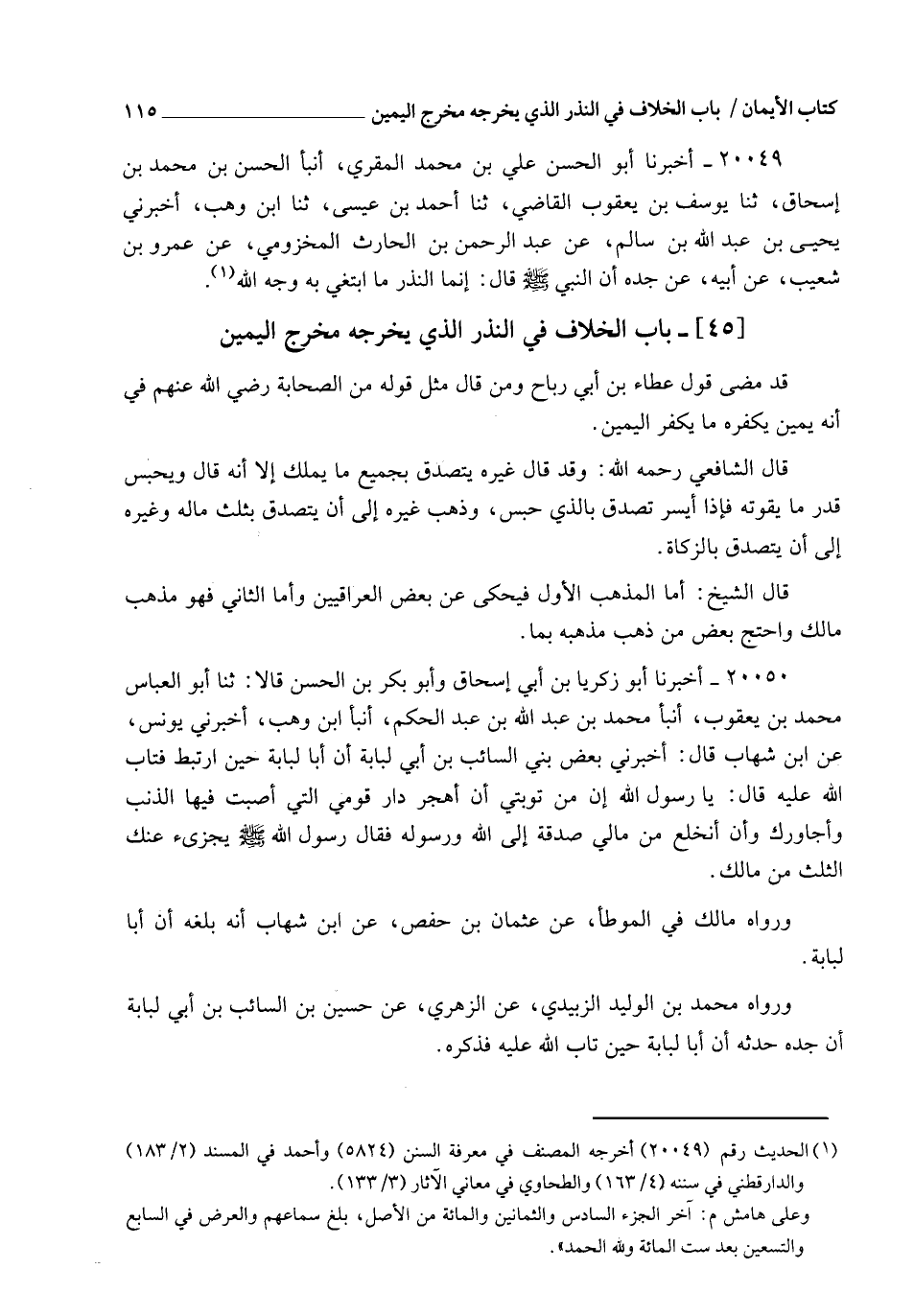 20049 - أَخْبَرَنَا أَبُو الْحَسَنِ عَلِيُّ بْنُ مُحَمَّدٍ الْمُقْرِئُ أنبأ الْحَسَنُ بْنُ مُحَمَّدِ بْنِ إِسْحَاقَ , ثنا يُوسُفُ بْنُ يَعْقُوبَ الْقَاضِي , ثنا أَحْمَدُ بْنُ عِيسَى , ثنا ابْنُ وَهْبٍ , أَخْبَرَنِي يَحْيَى بْنُ عَبْدِ اللهِ بْنِ سَالِمٍ , عَنْ عَبْدِ الرَّحْمَنِ بْنِ الْحَارِثِ الْمَخْزُومِيِّ , عَنْ عَمْرِو بْنِ شُعَيْبٍ , عَنْ أَبِيهِ , عَنْ جَدِّهِ أَنَّ النَّبِيَّ صَلَّى اللهُ عَلَيْهِ وَسَلَّمَ قَالَ: §" إِنَّمَا النَّذْرُ مَا ابْتُغِيَ بِهِ وَجْهُ اللهِ "