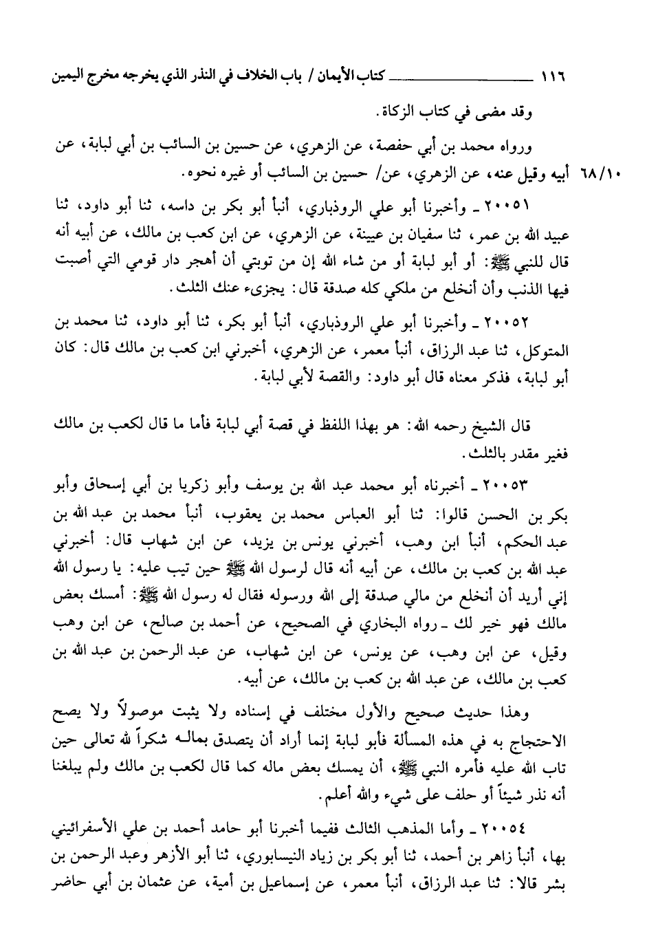 20053 - أَخْبَرَنَاهُ أَبُو مُحَمَّدٍ عَبْدُ اللهِ بْنُ يُوسُفَ , وَأَبُو زَكَرِيَّا بْنُ أَبِي إِسْحَاقَ , وَأَبُو بَكْرِ بْنُ الْحَسَنِ قَالُوا: ثنا أَبُو الْعَبَّاسِ مُحَمَّدُ بْنُ يَعْقُوبَ , أنبأ مُحَمَّدُ بْنُ عَبْدِ اللهِ بْنِ عَبْدِ الْحَكَمِ , أنبأ ابْنُ وَهْبٍ , أَخْبَرَنِي يُونُسُ بْنُ يَزِيدَ , عَنِ ابْنِ شِهَابٍ قَالَ: أَخْبَرَنِي عَبْدُ اللهِ بْنُ كَعْبِ بْنِ مَالِكٍ , عَنْ أَبِيهِ أَنَّهُ قَالَ لِرَسُولِ اللهِ صَلَّى اللهُ عَلَيْهِ وَسَلَّمَ حِينَ تِيبَ عَلَيْهِ: يَا رَسُولَ اللهِ , إِنِّي أُرِيدُ أَنْ أَنْخَلِعَ مِنْ مَالِي صَدَقَةً إِلَى اللهِ وَرَسُولِهِ , فَقَالَ لَهُ رَسُولُ اللهِ صَلَّى اللهُ عَلَيْهِ وَسَلَّمَ: §" أَمْسِكْ بَعْضَ مَالِكَ , فَهُوَ خَيْرٌ لَكَ ". رَوَاهُ الْبُخَارِيُّ فِي الصَّحِيحِ , عَنْ أَحْمَدَ بْنِ صَالِحٍ عَنِ ابْنِ وَهْبٍ , وَقِيلَ: عَنِ ابْنِ وَهْبٍ , عَنْ يُونُسَ , عَنِ ابْنِ شِهَابٍ , عَنْ عَبْدِ الرَّحْمَنِ بْنِ عَبْدِ اللهِ بْنِ كَعْبِ بْنِ مَالِكٍ، عَنْ عَبْدِ اللهِ بْنِ كَعْبِ بْنِ مَالِكٍ، عَنْ أَبِيهِ. وَهَذَا حَدِيثٌ صَحِيحٌ وَالْأَوَّلُ مُخْتَلَفٌ فِي إِسْنَادِهِ , وَلَا يَثْبُتُ مَوْصُولًا , وَلَا يَصِحُّ الِاحْتِجَاجُ بِهِ فِي هَذِهِ الْمَسْأَلَةِ فَأَبُو لُبَابَةَ إِنَّمَا أَرَادَ أَنْ يَتَصَدَّقَ بِمَالِهِ شُكْرًا لِلَّهِ تَعَالَى حِينَ تَابَ اللهُ عَلَيْهِ , فَأَمَرَهُ النَّبِيُّ صَلَّى اللهُ عَلَيْهِ وَسَلَّمَ أَنْ يُمْسِكَ بَعْضَ مَالِهِ كَمَا قَالَ لِكَعْبِ بْنِ مَالِكٍ , وَلَمْ يَبْلُغْنَا أَنَّهُ نَذَرَ شَيئًا , أَوْ حَلَفَ عَلَى شَيْءٍ , وَاللهُ أَعْلَمُ
