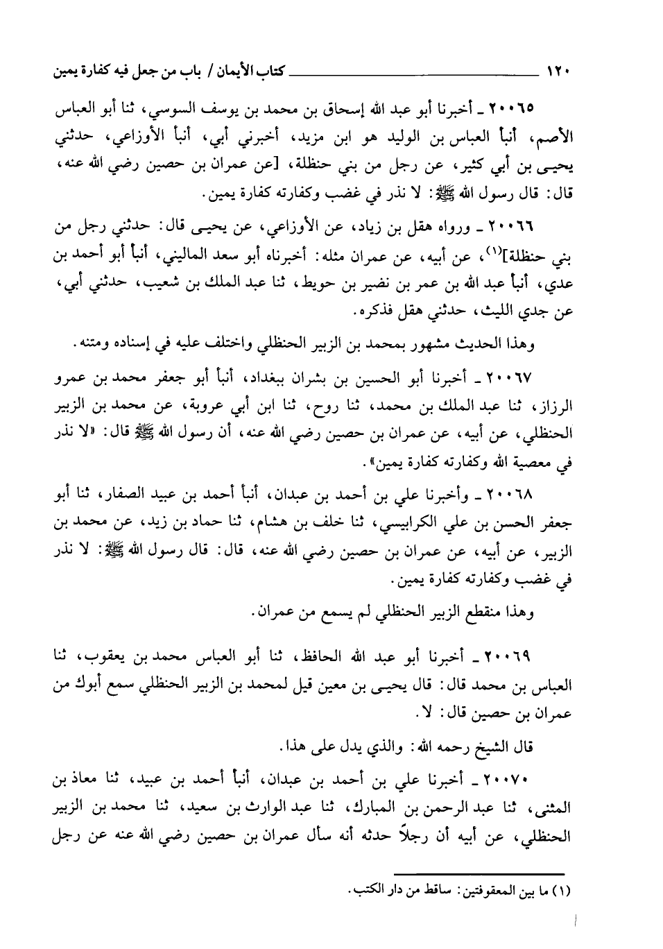 20070 - مَا أَخْبَرَنَا عَلِيُّ بْنُ أَحْمَدَ بْنِ عَبْدَانَ , أنبأ أَحْمَدُ بْنُ عُبَيْدٍ , ثنا مُعَاذُ بْنُ الْمُثَنَّى , ثنا عَبْدُ الرَّحْمَنِ بْنُ الْمُبَارَكِ , ثنا عَبْدُ الْوَارِثِ بْنُ سَعِيدٍ , ثنا مُحَمَّدُ بْنُ الزُّبَيْرِ الْحَنْظَلِيُّ , عَنْ أَبِيهِ أَنَّ رَجُلًا , حَدَّثَهُ أَنَّهُ سَأَلَ عِمْرَانَ بْنَ حُصَيْنٍ رَضِيَ اللهُ عَنْهُ عَنْ رَجُلٍ -[121]- حَلَفَ أَنَّهُ لَا يُصَلِّي فِي مَسْجِدِ قَوْمِهِ؟ فَقَالَ عِمْرَانُ رَضِيَ اللهُ عَنْهُ: سَمِعْتُ رَسُولَ اللهِ صَلَّى اللهُ عَلَيْهِ وَسَلَّمَ يَقُولُ: §" لَا نَذْرَ فِي مَعْصِيَةِ اللهِ , وَكَفَّارَتُهُ كَفَّارَةُ يَمِينٍ ". وَقِيلَ: عَنْ مُحَمَّدِ بْنِ الزُّبَيْرِ الْحَنْظَلِيِّ , عَنْ رَجُلٍ صَحِبَهُ , عَنْ عِمْرَانَ