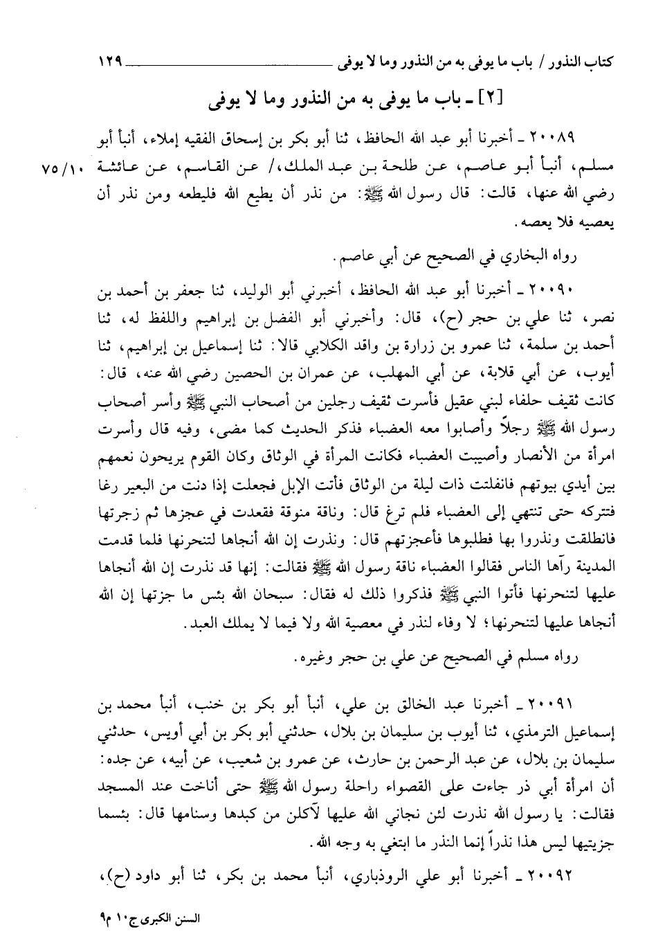 20090 - أَخْبَرَنَا أَبُو عَبْدِ اللهِ الْحَافِظُ , أَخْبَرَنِي أَبُو الْوَلِيدِ , ثنا جَعْفَرُ بْنُ أَحْمَدَ بْنِ نَصْرٍ , ثنا عَلِيُّ بْنُ حُجْرٍ ح، قَالَ: وَأَخْبَرَنِي أَبُو الْفَضْلِ بْنُ إِبْرَاهِيمَ , وَاللَّفْظُ لَهُ , ثنا أَحْمَدُ بْنُ سَلَمَةَ , ثنا عَمْرُو بْنُ زُرَارَةَ بْنِ وَاقِدٍ الْكِلَابِيُّ قَالَا: ثنا إِسْمَاعِيلُ بْنُ إِبْرَاهِيمَ , ثنا أَيُّوبُ , عَنْ أَبِي قِلَابَةَ , عَنْ أَبِي الْمُهَلَّبِ , عَنْ عِمْرَانَ بْنِ الْحُصَيْنِ رَضِيَ اللهُ عَنْهُ قَالَ: كَانَتْ ثَقِيفُ حُلَفَاءَ لِبَنِي عُقَيْلٍ فَأَسَرَتْ ثَقِيفُ رَجُلَيْنِ مِنْ أَصْحَابِ النَّبِيِّ صَلَّى اللهُ عَلَيْهِ وَسَلَّمَ , وَأَسَرَ أَصْحَابُ رَسُولِ اللهِ صَلَّى اللهُ عَلَيْهِ وَسَلَّمَ رَجُلًا , وَأَصَابُوا مَعَهُ الْعَضْبَاءَ فَذَكَرَ الْحَدِيثَ كَمَا مَضَى وَفِيهِ قَالَ: وَأُسِرَتِ امْرَأَةٌ مِنَ الْأَنْصَارِ وَأُصِيبَتِ الْعَضْبَاءُ فَكَانَتِ الْمَرْأَةُ فِي الْوَثَاقِ , وَكَانَ الْقَوْمُ يُرِيحُونَ نَعَمَهُمْ بَيْنَ أَيْدِي بُيُوتِهِمْ , فَانْفَلَتَتْ ذَاتَ لَيْلَةٍ مِنَ الْوَثَاقِ , فَأَتَتِ الْإِبِلَ , فَجَعَلَتْ إِذَا دَنَتْ مِنَ الْبَعِيرِ رَغَا فَتَتْرُكُهُ حَتَّى تَنْتَهِيَ إِلَى الْعَضْبَاءِ فَلَمْ تَرْغُ قَالَ: وَنَاقَةٌ مَنُوقَةٌ فَقَعَدَتْ فِي عَجُزِهَا , ثُمَّ زَجَرَتْهَا فَانْطَلَقَتْ وَنَذَرُوا بِهَا فَطَلَبُوهَا فَأَعْجَزَتْهُمْ قَالَ: وَنَذَرَتْ إِنِ اللهُ أَنْجَاهَا لَتَنْحَرَنَّهَا فَلَمَّا قَدِمَتِ الْمَدِينَةَ رَآهَا النَّاسُ فَقَالُوا: " الْعَضْبَاءُ نَاقَةُ رَسُولِ اللهِ صَلَّى اللهُ عَلَيْهِ وَسَلَّمَ , فَقَالَ: إِنَّهَا قَدْ نَذَرَتْ إِنِ اللهُ أَنْجَاهَا عَلَيْهَا لَتَنْحَرَنَّهَا فَأَتَوَا النَّبِيَّ صَلَّى اللهُ عَلَيْهِ وَسَلَّمَ , فَذَكَرُوا ذَلِكَ لَهُ , فَقَالَ: " سُبْحَانَ اللهِ §بِئْسَ مَا جَزَتْهَا إِنِ اللهُ أَنْجَاهَا عَلَيْهَا لَتَنْحَرَنَّهَا لَا وَفَاءَ لِنَذْرٍ فِي مَعْصِيَةِ اللهِ , وَلَا فِيمَا لَا يَمْلِكُ الْعَبْدُ ". رَوَاهُ مُسْلِمٌ فِي الصَّحِيحِ , عَنْ عَلِيِّ بْنِ حُجْرٍ وَغَيْرِهِ