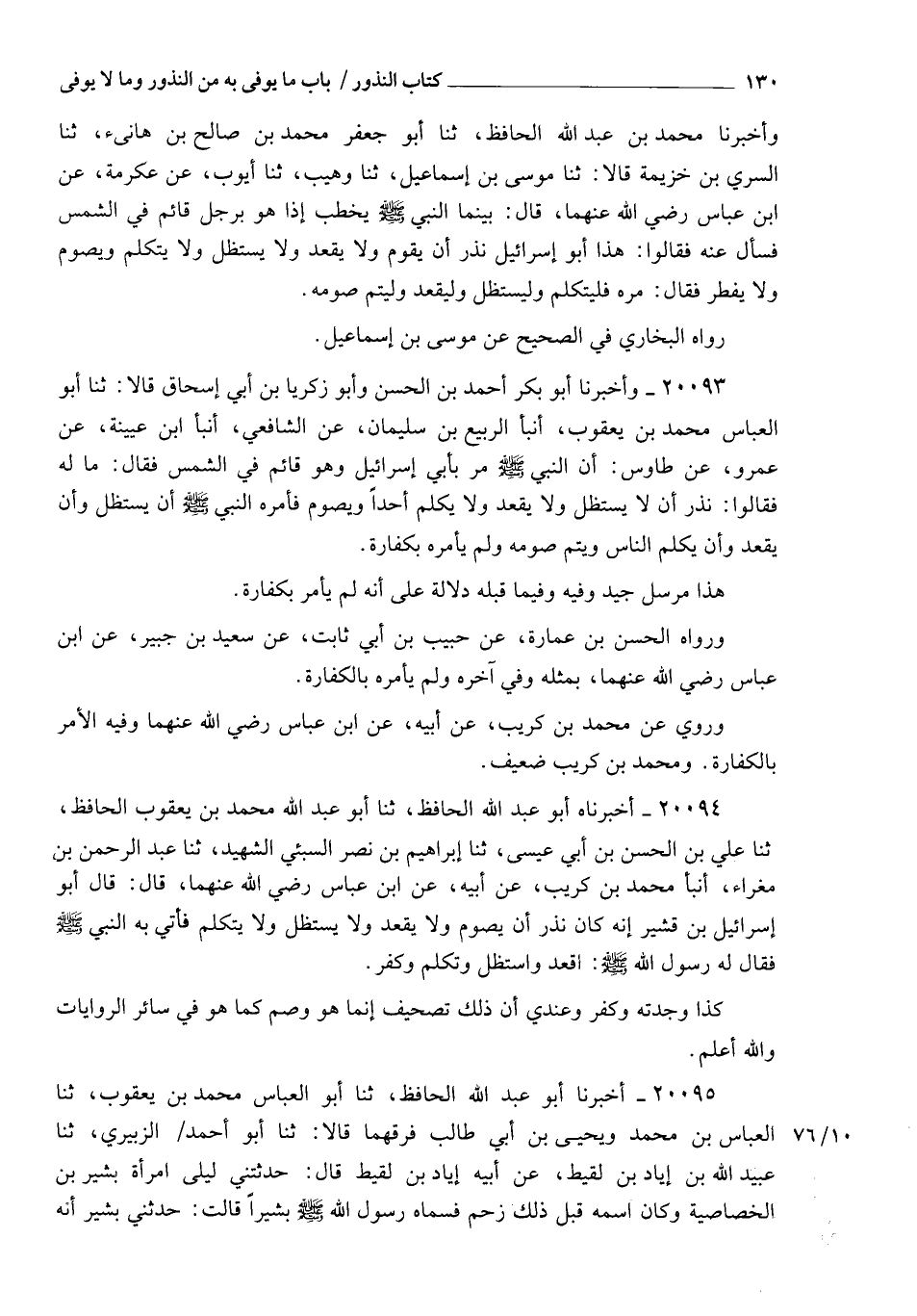 20094 - أَخْبَرَنَاهُ أَبُو عَبْدِ اللهِ الْحَافِظُ , ثنا أَبُو عَبْدِ اللهِ مُحَمَّدُ بْنُ يَعْقُوبَ الْحَافِظُ ثنا عَلِيُّ بْنُ الْحَسَنِ بْنِ أَبِي عِيسَى , ثنا إِبْرَاهِيمُ بْنُ نَصْرٍ السَّبَئِيُّ الشَّهِيدُ , ثنا عَبْدُ الرَّحْمَنِ بْنُ مَغْرَاءَ , أنبأ مُحَمَّدُ بْنُ كُرَيْبٍ , عَنْ أَبِيهِ , عَنِ ابْنِ عَبَّاسٍ رَضِيَ اللهُ عَنْهُمَا قَالَ: قَالَ أَبُو إِسْرَائِيلَ بْنُ قُشَيْرٍ إِنَّهُ كَانَ نَذَرَ أَنْ يَصُومَ , وَلَا يَقْعُدَ , وَلَا يَسْتَظِلَّ , وَلَا يَتَكَلَّمَ " , فَأُتِيَ بِهِ النَّبِيُّ صَلَّى اللهُ عَلَيْهِ وَسَلَّمَ , فَقَالَ لَهُ رَسُولُ اللهِ صَلَّى اللهُ عَلَيْهِ وَسَلَّمَ: §" اقْعُدْ , وَاسْتَظِلَّ , وَتَكَلَّمْ , وَكَفِّرْ ". كَذَا وَجَدْتُهُ " وَكَفِّرْ " وَعِنْدِي أَنَّ ذَلِكَ تَصْحِيفٌ , إِنَّمَا هُوَ: " وَصُمْ " كَمَا هُوَ فِي سَائِرِ الرِّوَايَاتِ , وَاللهُ أَعْلَمُ