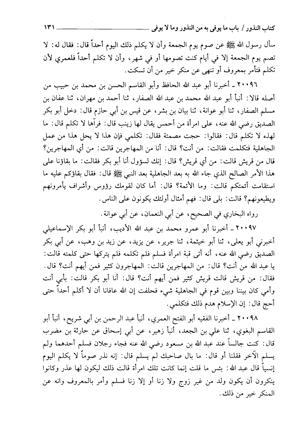 20098 - أَخْبَرَنَا الْفَقِيهُ أَبُو الْفَتْحِ الْعُمَرِيُّ , أنبأ عَبْدُ الرَّحْمَنِ بْنُ أَبِي شُرَيْحٍ , أنبأ أَبُو الْقَاسِمِ الْبَغَوِيُّ , ثنا عَلِيُّ بْنُ الْجَعْدِ , أنبأ زُهَيْرٌ , عَنْ أَبِي إِسْحَاقَ , عَنْ حَارِثَةَ بْنِ مُضَرِّبٍ قَالَ: كُنْتُ جَالِسًا عِنْدَ عَبْدِ اللهِ بْنِ مَسْعُودٍ رَضِيَ اللهُ عَنْهُ , فَجَاءَ رَجُلَانِ , فَسَلَّمَ أَحَدُهُمَا , وَلَمْ يُسَلِّمِ الْآخَرُ , فَقُلْنَا , أَوْ قَالَ: " مَا بَالُ صَاحِبِكَ لَمْ يُسَلِّمْ؟ " قَالَ: " إِنَّهُ نَذَرَ صَوْمًا لَا يُكَلِّمُ الْيَوْمَ إِنْسِيًّا , قَالَ عَبْدُ اللهِ: §بِئْسَ مَا قُلْتَ إِنَّمَا كَانَتْ تِلْكَ امْرَأَةً , قَالَتْ ذَلِكَ لِيَكُونَ لَهَا عُذْرٌ , وَكَانُوا يُنْكِرُونَ أَنْ يَكُونَ وَلَدٌ مِنْ غَيْرِ زَوْجٍ , وَلَا زِنًا " , أَوْ: إِلَّا زِنًا , فَسَلِّمْ , وَمُرْ بِالْمَعْرُوفِ وَانْهَ عَنِ الْمُنْكَرِ خَيْرٌ مِنْ ذَلِكَ "