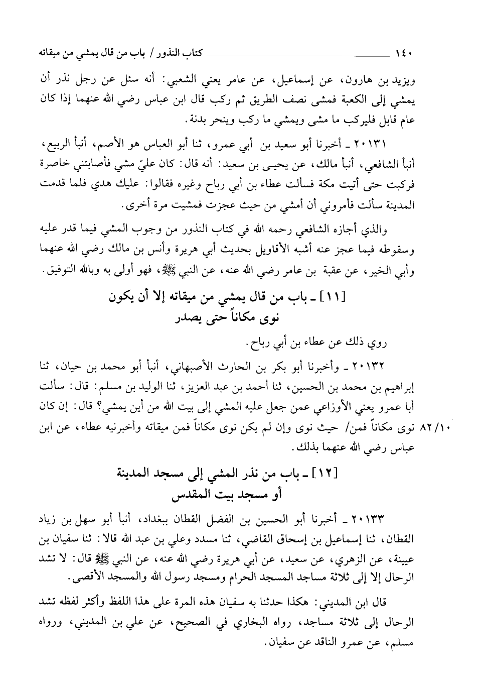 20132 - وَأَخْبَرَنَا أَبُو بَكْرِ بْنُ الْحَارِثُ الْأَصْبَهَانِيُّ , أنبأ أَبُو مُحَمَّدِ بْنُ حَيَّانَ , ثنا إِبْرَاهِيمُ بْنَ مُحَمَّدِ بْنِ الْحُسَيْنِ , ثنا أَحْمَدُ بْنُ عَبْدِ الْعَزِيزِ , ثنا الْوَلِيدُ بْنُ مُسْلِمٍ قَالَ: §سَأَلْتُ أَبَا عَمْرٍو - يَعْنِي الْأَوْزَاعِيَّ عَمَّنْ جَعَلَ عَلَيْهِ الْمَشْيَ إِلَى بَيْتِ اللهِ , مِنْ أَيْنَ يَمْشِي؟ قَالَ: " إِنْ كَانَ نَوَى مَكَانًا فَمِنْ حَيْثُ نَوَى , وَإِنْ لَمْ يَكُنْ نَوَى مَكَانًا فَمِنْ مِيقَاتِهِ ". وَأَخْبَرَنِيهِ عَطَاءٌ عَنِ ابْنِ عَبَّاسٍ رَضِيَ اللهُ عَنْهُمَا بِذَلِكَ