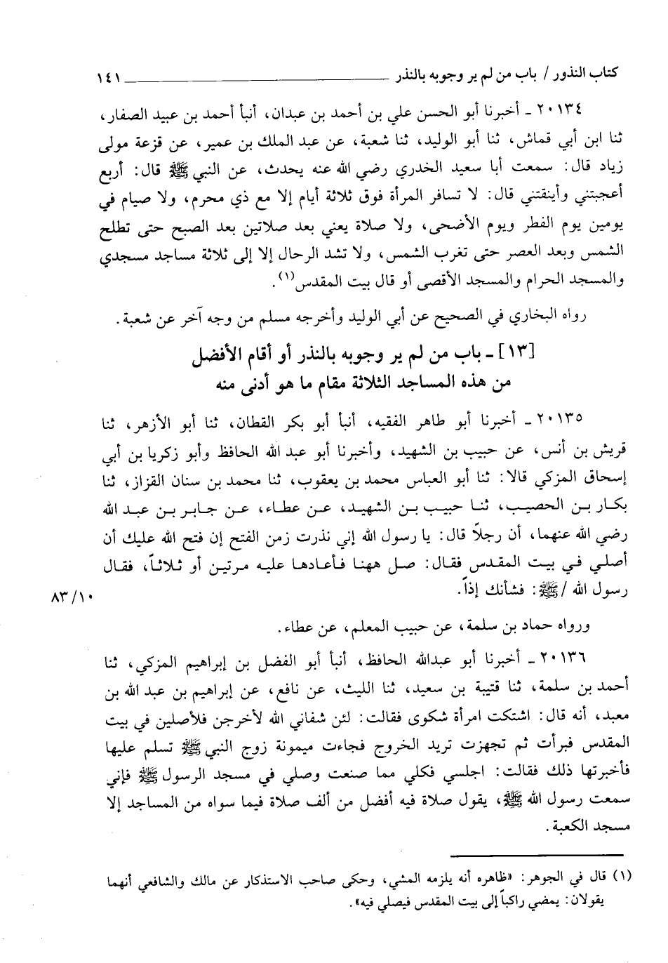 20135 - أَخْبَرَنَا أَبُو طَاهِرٍ الْفَقِيهُ , أنبأ أَبُو بَكْرٍ الْقَطَّانُ , ثنا أَبُو الْأَزْهَرِ , ثنا قُرَيْشُ بْنُ أَنَسٍ , عَنْ حَبِيبِ بْنِ الشَّهِيدِ , وَأَخْبَرَنَا أَبُو عَبْدِ اللهِ الْحَافِظُ , وَأَبُو زَكَرِيَّا بْنُ أَبِي إِسْحَاقَ الْمُزَكِّي قَالَا: ثنا أَبُو الْعَبَّاسِ مُحَمَّدُ بْنُ يَعْقُوبَ , ثنا مُحَمَّدُ بْنُ سِنَانٍ الْقَزَّازُ , ثنا بَكَّارُ بْنُ الْحُصَيْبِ , ثنا حَبِيبُ بْنُ الشَّهِيدِ , عَنْ عَطَاءٍ , عَنْ جَابِرِ بْنِ عَبْدِ اللهِ رَضِيَ اللهُ عَنْهُمَا §أَنَّ رَجُلًا قَالَ: يَا رَسُولَ اللهِ , إِنِّي نَذَرْتُ زَمَنَ الْفَتْحِ , إِنْ فَتْحَ اللهُ عَلَيْكَ أَنْ أُصَلِّيَ فِي بَيْتِ الْمَقْدِسِ , فَقَالَ: " صَلِّ هَهُنَا " , فَأَعَادَهَا عَلَيْهِ مَرَّتَيْنِ , أَوْ ثَلَاثًا , فَقَالَ رَسُولُ اللهِ صَلَّى اللهُ عَلَيْهِ وَسَلَّمَ: " فَشَأْنَكَ إِذًا ". وَرَوَاهُ حَمَّادُ بْنُ سَلَمَةَ عَنْ حَبِيبٍ الْمُعَلِّمِ عَنْ عَطَاءٍ