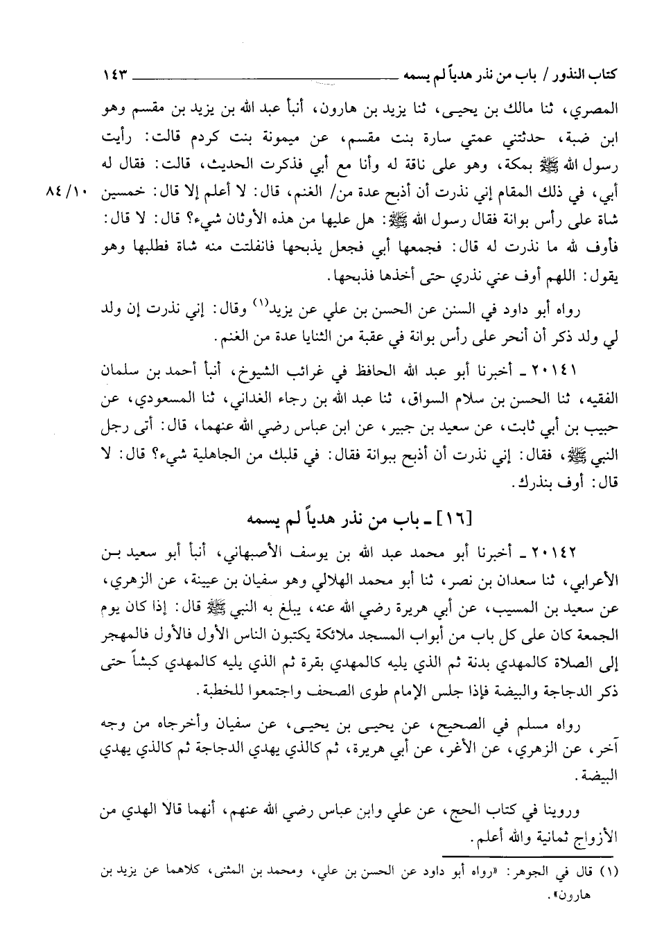 20142 - أَخْبَرَنَا أَبُو مُحَمَّدٍ عَبْدُ اللهِ بْنُ يُوسُفَ الْأَصْبَهَانِيُّ , أنبأ أَبُو سَعِيدِ بْنُ الْأَعْرَابِيِّ , ثنا سَعْدَانُ بْنُ نَصْرٍ , ثنا أَبُو مُحَمَّدٍ الْهِلَالِيُّ - وَهُوَ سُفْيَانُ بْنُ عُيَيْنَةَ , عَنِ الزُّهْرِيِّ , عَنْ سَعِيدِ بْنِ الْمُسَيِّبِ , عَنْ أَبِي هُرَيْرَةَ رَضِيَ اللهُ عَنْهُ يَبْلُغُ بِهِ النَّبِيَّ صَلَّى اللهُ عَلَيْهِ وَسَلَّمَ قَالَ: §" إِذَا كَانَ يَوْمُ الْجُمُعَةِ كَانَ عَلَى كُلِّ بَابٍ مِنْ أَبْوَابِ الْمَسْجِدِ مَلَائِكَةٌ يَكْتُبُونَ النَّاسَ , الْأَوَّلَ فَالْأَوَّلَ فَالْمُهَجِّرُ إِلَى الصَّلَاةِ كَالْمُهْدِي بَدَنَةً , ثُمَّ الَّذِي يَلِيهِ كَالْمُهْدِي بَقَرَةً , ثُمَّ الَّذِي يَلِيهِ كَالْمُهْدِي كَبْشًا حَتَّى ذَكَرَ الدَّجَاجَةَ وَالْبَيْضَةَ , فَإِذَا جَلَسَ الْإِمَامُ طَوَوُا الصُّحُفَ , وَاجْتَمَعُوا لِلْخُطْبَةِ ". رَوَاهُ مُسْلِمٌ فِي الصَّحِيحِ , عَنْ يَحْيَى بْنِ يَحْيَى عَنْ سُفْيَانَ، وَأَخْرَجَاهُ مِنْ وَجْهٍ آخَرَ عَنِ الزُّهْرِيِّ عَنِ الْأَغَرِّ عَنْ أَبِي هُرَيْرَةَ " ثُمَّ كَالَّذِي يُهْدِي الدَّجَاجَةَ , ثُمَّ كَالَّذِي يُهْدِي الْبَيْضَةَ ". وَرَوَيْنَا فِي كِتَابِ الْحَجِّ , عَنْ عَلِيٍّ وَابْنِ عَبَّاسٍ رَضِيَ اللهُ عَنْهُمْ أَنَّهُمَا قَالَا: الْهَدْيُ مِنَ الْأَزْوَاجِ ثَمَانِيَةٌ , وَاللهُ أَعْلَمُ