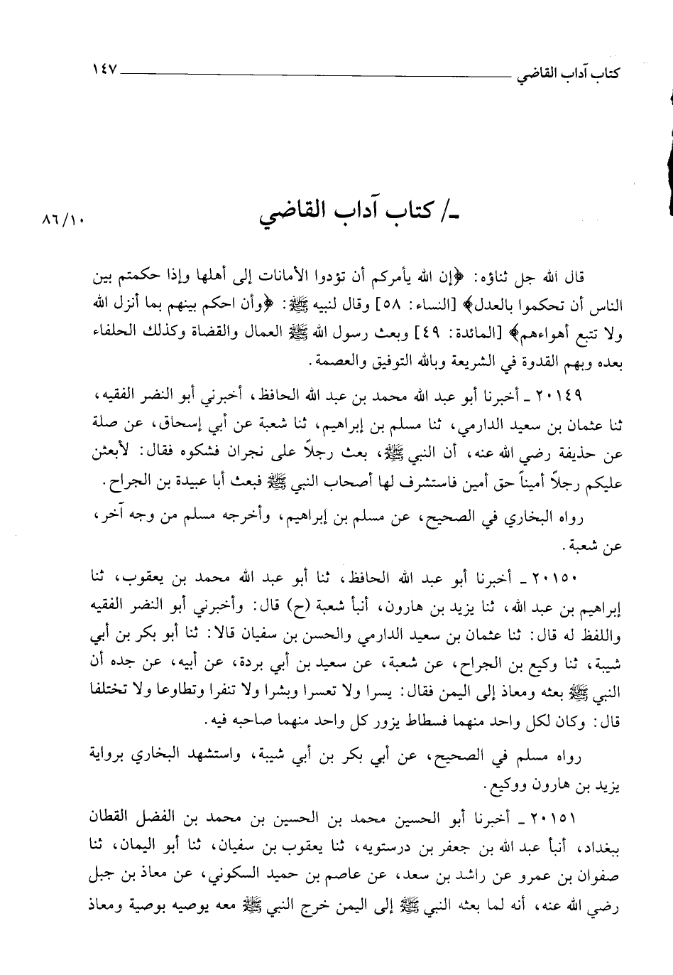 20149 - أَخْبَرَنَا أَبُو عَبْدِ اللهِ مُحَمَّدُ بْنُ عَبْدِ اللهِ الْحَافِظُ , أَخْبَرَنِي أَبُو النَّضْرِ الْفَقِيهُ , ثنا عُثْمَانُ بْنُ سَعِيدٍ الدَّارِمِيُّ , ثنا مُسْلِمُ بْنُ إِبْرَاهِيمَ , ثنا شُعْبَةُ , عَنْ أَبِي إِسْحَاقَ , عَنْ صِلَةَ , عَنْ حُذَيْفَةَ رَضِيَ اللهُ عَنْهُ أَنَّ النَّبِيَّ صَلَّى اللهُ عَلَيْهِ وَسَلَّمَ بَعَثَ رَجُلًا عَلَى نَجْرَانَ , فَشَكَوْهُ , فَقَالَ: §" لَأَبْعَثَنَّ عَلَيْكُمْ رَجُلًا أَمِينًا حَقَّ أَمِينٍ " فَاسْتَشْرَفَ لَهَا أَصْحَابُ النَّبِيِّ صَلَّى اللهُ عَلَيْهِ وَسَلَّمَ , فَبَعَثَ أَبَا عُبَيْدَةَ بْنَ الْجَرَّاحِ ". رَوَاهُ الْبُخَارِيُّ فِي الصَّحِيحِ عَنْ مُسْلِمِ بْنِ إِبْرَاهِيمَ، وَأَخْرَجَهُ مُسْلِمٌ مِنْ وَجْهٍ آخَرَ , عَنْ شُعْبَةَ