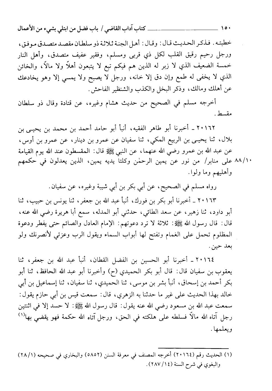 20162 - أَخْبَرَنَا أَبُو طَاهِرٍالْفَقِيهُ , أنبأ أَبُو حَامِدٍ أَحْمَدُ بْنُ مُحَمَّدِ بْنِ يَحْيَى بْنِ بِلَالٍ، ثنا يَحْيَى بْنُ الرَّبِيعِ الْمَكِّيُّ , ثنا سُفْيَانُ , عَنْ عَمْرِو بْنِ دِينَارٍ , عَنْ عَمْرِو بْنِ أَوْسٍ , عَنْ عَبْدِ اللهِ بْنِ عَمْرٍو رَضِيَ اللهُ عَنْهُمَا , عَنِ النَّبِيِّ صَلَّى اللهُ عَلَيْهِ وَسَلَّمَ قَالَ: §" الْمُقْسِطُونَ عِنْدَ اللهِ يَوْمَ الْقِيَامَةِ عَلَى مَنَابِرَ مِنْ نُورٍ , عَنْ يَمِينِ الرَّحْمَنِ , وَكِلْتَا يَدَيْهِ يَمِينٌ، الَّذِينَ يَعْدِلُونَ فِي حُكْمِهِمْ وَأَهْلِيهِمْ , وَمَا وُلُّوا ". رَوَاهُ مُسْلِمٌ فِي الصَّحِيحِ عَنْ أَبِي بَكْرِ بْنِ أَبِي شَيْبَةَ وَغَيْرِهِ , عَنْ سُفْيَانَ