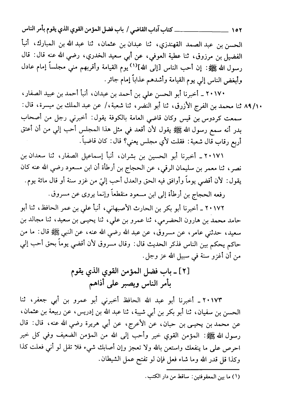 20171 - أَخْبَرَنَا أَبُو الْحُسَيْنِ بْنُ بِشْرَانَ , أنبأ إِسْمَاعِيلُ الصَّفَّارُ , ثنا سَعْدَانُ بْنُ نَصْرٍ , ثنا مَعْمَرُ بْنُ سُلَيْمَانَ الرَّقِّيُّ , عَنِ الْحَجَّاجِ بْنِ أَرْطَاةَ، أَنَّ ابْنَ مَسْعُودٍ , رَضِيَ اللهُ عَنْهُ كَانَ يَقُولُ: §" لَأَنْ أَقْضِيَ يَوْمًا , وَأُوَافِقَ فِيهِ الْحَقَّ وَالْعَدْلَ , أَحَبُّ إِلِيَّ مِنْ غَزْوِ سَنَةٍ " أَوْ قَالَ: " مِائَةِ يَوْمٍ " رَفَعَهُ الْحَجَّاجُ بْنُ أَرْطَاةَ إِلَى ابْنِ مَسْعُودٍ مُنْقَطِعًا , وَإِنَّمَا يُرْوَى عَنْ مَسْرُوقٍ