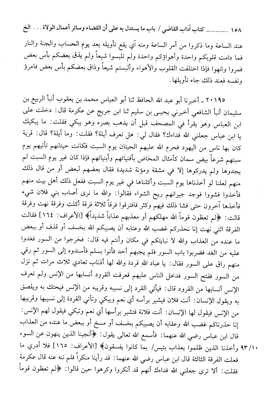 20195 - أَخْبَرَنَا أَبُو عَبْدِ اللهِ الْحَافِظُ , ثنا أَبُو الْعَبَّاسِ مُحَمَّدُ بْنُ يَعْقُوبَ، أنبأ الرَّبِيعُ بْنُ سُلَيْمَانَ , أنبأ الشَّافِعِيُّ , أَخْبَرَنِي يَحْيَى بْنُ سُلَيْمٍ , ثنا ابْنُ جُرَيْجٍ , عَنْ عِكْرِمَةَ، قَالَ: دَخَلْتُ عَلَى ابْنِ الْعَبَّاسِ وَهُوَ يَقْرَأُ فِي الْمُصْحَفِ قَبْلَ أَنْ يَذْهَبَ بَصَرُهُ وَهُوَ يَبْكِي , فَقُلْتُ: " مَا يُبْكِيكَ يَا ابْنَ عَبَّاسٍ؟ جَعَلَنِي اللهُ فِدَاءَكَ "، §فَقَالَ لِي: " هَلْ تَعْرِفُ أَيْلَةَ " , فَقُلْتُ: " وَمَا أَيْلَةُ؟ " , قَالَ: " قَرْيَةٌ كَانَ بِهَا نَاسٌ مِنَ الْيَهُودِ فَحَرَّمَ اللهُ عَلَيْهِمُ الْحِيتَانَ يَوْمَ السَّبْتِ , فَكَانَتْ حِيتَانُهُمْ تَأْتِيهِمْ يَوْمَ سَبْتِهِمْ شُرَّعًا بِيضٌ سِمَانٌ كَأَمْثَالِ الْمَخَاضِ بِأَفْنِيَائِهِمْ وَأَبْنِيَاتِهِمْ فَإِذَا كَانَ غَيْرَ يَوْمِ السَّبْتِ لَمْ يَجِدُوهَا , وَلَمْ يُدْرِكُوهَا إِلَّا فِي مَشَقَّةٍ وَمَؤوُنَةٍ شَدِيدَةٍ , فَقَالَ بَعْضُهُمْ لِبَعْضٍ , أَوْ مَنْ قَالَ ذَلِكَ مِنْهُمْ: " لَعَلَّنَا لَوْ أَخَذْنَاهَا يَوْمَ السَّبْتِ , وَأَكَلْنَاهَا فِي غَيْرِ يَوْمِ السَّبْتِ " , فَفَعَلَ ذَلِكَ أَهْلُ بَيْتٍ مِنْهُمْ , فَأَخَذُوا؛ فَشَوَوْا؛ فَوَجَدَ جِيرَانُهُمْ رِيحَ الشِّوَاءِ , فَقَالُوا: " وَاللهِ مَا نَرَى أَصَابَ بَنِي فُلَانٍ شَيْءٌ " , فَأَخَذَهَا آخَرُونَ حَتَّى فَشَا ذَلِكَ فِيهِمْ وَكَثُرَ , فَافْتَرَقُوا فِرَقًا ثَلَاثَةً: فِرْقَةٌ أَكَلَتْ , وَفِرْقَةٌ نَهَتْ , وَفِرْقَةٌ قَالَتْ " {لِمَ تَعِظُونَ قَوْمًا اللهُ مُهْلِكُهُمْ أَوْ مُعَذِّبُهُمْ عَذَابًا شَدِيدًا} [الأعراف: 164] " فَقَالَتِ الْفُرْقَةُ الَّتِي نَهَتْ: إِنَّا نُحَذِّرُكُمْ غَضَبَ اللهِ وَعِتَابَهُ أَنْ يُصِيبَكُمُ اللهُ بِخَسْفٍ أَوْ قَذْفٍ أَوْ بِبَعْضِ مَا عِنْدَهُ مِنَ الْعَذَابِ، وَاللهِ لَا نُبَايِتُكُمْ فِي مَكَانٍ وَأَنْتُمْ فِيهِ "، قَالَ: " فَخَرَجُوا مِنَ السُّورِ , فَغَدَوْا عَلَيْهِ مِنَ الْغَدِ , فَضَرَبُوا بَابَ السُّورِ , فَلَمْ يُجِبْهُمْ أَحَدٌ , فَأَتَوْا بِسُلَّمٍ , فَأَسْنَدُوهُ إِلَى السُّورِ , ثُمَّ رَقِيَ مِنْهُمْ رَاقٍ عَلَى السُّورِ , فَقَالَ: يَا عِبَادَ اللهِ , قِرَدَةٌ وَاللهِ لَهَا أَذْنَابٌ تَعَادَى , ثَلَاثَ مَرَّاتٍ , ثُمَّ نَزَلَ مِنَ السُّورِ , فَفَتَحَ السُّورَ , فَدَخَلَ النَّاسُ عَلَيْهِمْ , فَعَرَفَتِ الْقُرُودُ أَنْسَابَهَا مِنَ الْإِنْسِ , وَلَمْ تَعْرِفِ الْإِنْسُ أَنْسَابَهَا مِنَ الْقُرُودِ , قَالَ: فَيَأْتِي الْقِرْدُ إِلَى نَسِيبِهِ وَقَرِيبِهِ مِنَ الْإِنْسِ , فَيَحْتَكُّ بِهِ , وَيَلْصَقُ بِهِ , وَيَقُولُ الْإِنْسَانُ: " أَنْتَ فُلَانٌ؟ " فَيُشِيرُ بِرَأْسِهِ , أَيْ: نَعَمْ , وَيَبْكِي , وَتَأْتِي الْقِرْدَةُ إِلَى نَسِيبِهَا وَقَرِيبِهَا مِنَ الْإِنْسِ , فَيَقُولُ لَهَا الْإِنْسَانُ: " أَنْتِ فُلَانَةُ؟ " فتشيرُ بِرَأْسِهَا , أَيْ: نَعَمْ , وَتَبْكِي , فَيَقُولُ لَهُمُ الْإِنْسُ: " إِنَّا حَذَّرْنَاكُمْ غَضَبَ اللهِ وَعِقَابَهُ أَنْ يُصِيبَكُمْ بِخَسْفٍ أَوْ مَسْخٍ أَوْ بِبَعْضِ مَا عِنْدَهُ مِنَ الْعَذَابِ، قَالَ ابْنُ عَبَّاسٍ رَضِيَ اللهُ عَنْهُمَا: فَأَسْمَعُ اللهَ تَعَالَى يَقُولُ {فأَنْجَيْنَا الَّذِينَ يَنْهَوْنَ عَنِ السُّوءِ وَأَخَذْنَا الَّذِينَ ظَلَمُوا بِعَذَابٍ بَئِيسٍ بِمَا كَانُوا يَفْسُقُونَ} فَلَا أَدْرِي مَا فَعَلْتِ الْفِرْقَةُ الثَّالِثَةُ؟ " قَالَ ابْنُ عَبَّاسٍ رَضِيَ اللهُ عَنْهُمَا: " فَكَمْ قَدْ رَأَيْنَا مُنْكَرًا فَلَمْ نَنْهَ عَنْهُ، قَالَ عِكْرِمَةُ: " فَقُلْتُ: أَلَا تَرَى - جَعَلَنِي اللهُ فِدَاءَكَ - أَنَّهُمْ قَدْ أَنْكَرُوا وَكَرِهُوا حِينَ قَالُوا: {لِمَ تَعِظُونَ قَوْمًا -[159]- اللهُ مُهْلِكُهُمْ أَوْ مُعَذِّبُهُمْ عَذَابًا شَد