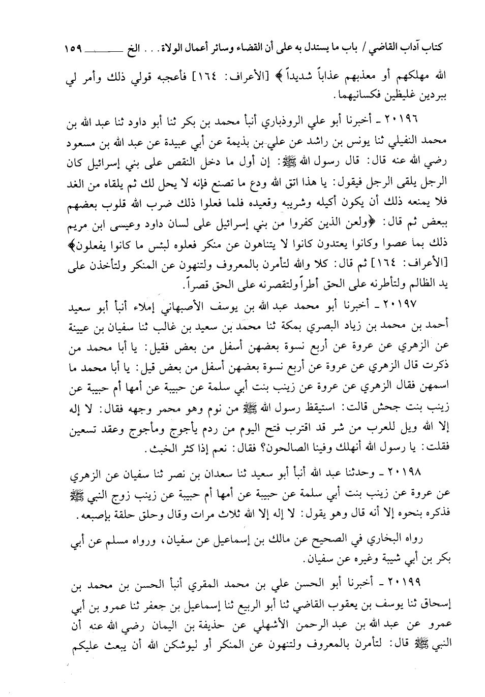20197 - أَخْبَرَنَا أَبُو مُحَمَّدٍ عَبْدُ اللهِ بْنُ يُوسُفَ الْأَصْبَهَانِيُّ، إِمْلَاءً، أنبأ أَبُو سَعِيدٍ أَحْمَدُ بْنُ مُحَمَّدِ بْنِ زِيَادٍ الْبَصْرِيُّ بِمَكَّةَ، ثنا مُحَمَّدُ بْنُ سَعِيدِ بْنِ غَالِبٍ , ثنا سُفْيَانُ بْنُ عُيَيْنَةَ , عَنِ الزُّهْرِيِّ , عَنْ عُرْوَةَ , عَنْ أَرْبَعِ نِسْوَةٍ , بَعْضُهُنَّ أَسْفَلُ مِنْ بَعْضٍ , فَقِيلَ: " يَا أَبَا مُحَمَّدٍ مَنْ ذَكَرْتَ؟ " , قَالَ الزُّهْرِيُّ , عَنْ عُرْوَةَ , عَنْ أَرْبَعِ نِسْوَةٍ بَعْضُهُنَّ أَسْفَلُ مِنْ بَعْضٍ، قِيلَ: " يَا أَبَا مُحَمَّدٍ مَا اسْمُهُنَّ؟ " , فَقَالَ الزُّهْرِيُّ: عَنْ عُرْوَةَ، عَنْ زَيْنَبَ بِنْتِ أَبِي سَلَمَةَ، عَنْ حَبِيبَةَ , عَنْ أُمِّهَا أُمِّ حَبِيبَةَ، عَنْ زَيْنَبَ بِنْتِ جَحْشٍ , قَالَتِ: اسْتَيْقَظَ رَسُولُ اللهِ صَلَّى اللهُ عَلَيْهِ وَسَلَّمَ مِنْ نَوْمٍ , وَهُوَ مُحْمَرٌّ وَجْهُهُ , فَقَالَ: " لَا إِلَهَ إِلَّا اللهُ، §وَيْلٌ لِلْعَرَبِ مِنْ شَرٍّ قَدِ اقْتَرَبَ , فُتِحَ الْيَوْمَ مِنْ رَدْمِ يَأْجُوجَ وَمَأْجُوجَ " وَعَقَدَ تِسْعِينَ، فَقُلْتُ: يَا رَسُولَ اللهِ , أَنَهْلِكُ وَفِينَا الصَّالِحُونَ؟ فَقَالَ: " نَعَمْ , إِذَا كَثُرَ الْخَبَثُ ".