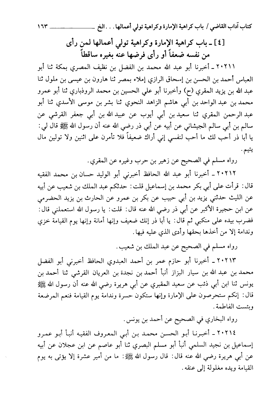20211 - أَخْبَرَنَا أَبُو عَبْدِ اللهِ مُحَمَّدُ بْنُ الْفَضْلِ بْنِ نَظِيفٍ الْمِصْرِيُّ بِمَكَّةَ، ثنا أَبُو الْعَبَّاسِ أَحْمَدُ بْنُ الْحَسَنِ بْنِ إِسْحَاقَ الرَّازِيُّ إِمْلَاءً بِمِصْرَ، ثنا هَارُونُ بْنُ عِيسَى بْنِ مَلُولٍ , ثنا عَبْدُ اللهِ بْنُ يَزِيدَ الْمُقْرِئُ ح وَأَخْبَرَنَا أَبُو عَلِيٍّ الْحُسَيْنُ بْنُ مُحَمَّدٍ الرُّوذْبَارِيُّ , ثنا أَبُو عَمْرٍو مُحَمَّدُ بْنُ عَبْدِ الْوَاحِدِ بْنِ أَبِي هَاشِمٍ الزَّاهِدُ النَّحْوِيُّ , ثنا بِشْرُ بْنُ مُوسَى الْأَسَدِيُّ , ثنا أَبُو عَبْدِ الرَّحْمَنِ الْمُقْرِئُ , ثنا سَعِيدُ بْنُ أَبِي أَيُّوبَ , عَنْ عُبَيْدِ اللهِ بْنِ أَبِي جَعْفَرٍ الْقُرَشِيِّ , عَنْ سَالِمِ بْنِ أَبِي سَالِمٍ الْجَيْشَانِيِّ , عَنْ أَبِيهِ , عَنْ أَبِي ذَرٍّ رَضِيَ اللهُ عَنْهُ , أَنَّ رَسُولَ اللهِ صَلَّى اللهُ عَلَيْهِ وَسَلَّمَ قَالَ لِي: " يَا أَبَا ذَرٍّ , §أُحِبُّ لَكَ مَا أُحِبُّ لِنَفْسِي , إِنِّي أَرَاكَ ضَعِيفًا , فَلَا تَأَمَّرَنَّ عَلَى اثْنَيْنِ , وَلَا تَوَلَّيَنَّ مَالَ يَتِيمٍ ". رَوَاهُ مُسْلِمٌ فِي الصَّحِيحِ , عَنْ زُهَيْرِ بْنِ حَرْبٍ وَغَيْرِهِ , عَنِ الْمُقْرِئِ