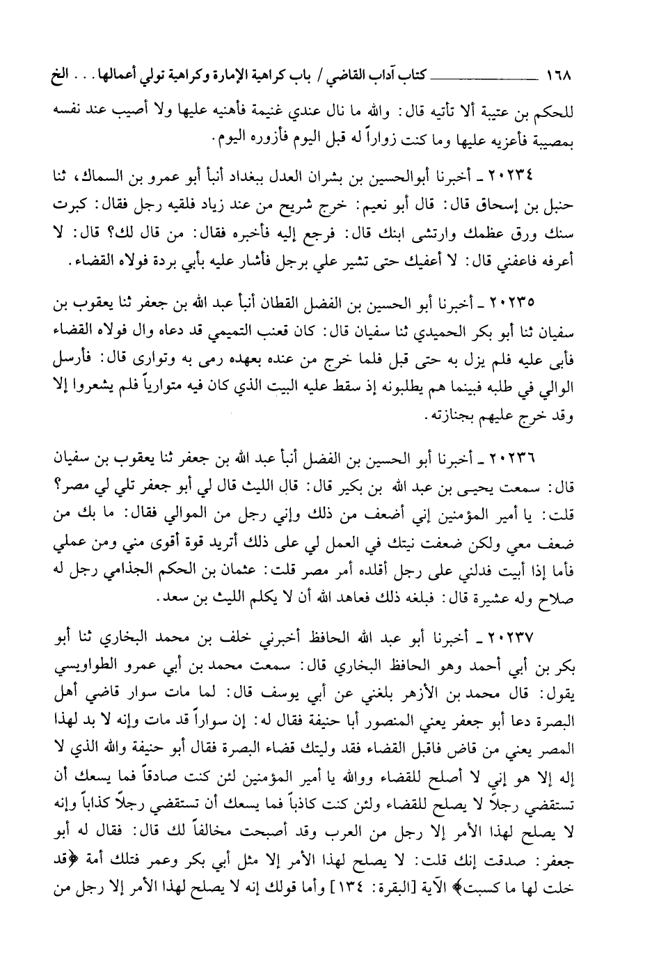 20237 - أَخْبَرَنَا أَبُو عَبْدِ اللهِ الْحَافِظُ , أَخْبَرَنِي خَلَفُ بْنُ مُحَمَّدٍ الْبُخَارِيُّ , ثنا أَبُو بَكْرِ بْنُ أَبِي أَحْمَدَ وَهُوَ الْحَافِظُ الْبُخَارِيُّ قَالَ: سَمِعْتُ مُحَمَّدَ بْنَ أَبِي عَمْرٍو الطَّوَاوِيسِيَّ يَقُولُ: قَالَ مُحَمَّدُ بْنُ الْأَزْهَرِ: بَلَغَنِي عَنْ أَبِي يُوسُفَ قَالَ: " لَمَّا مَاتَ سَوَّارٌ قَاضِي أَهْلِ الْبَصْرَةِ دَعَا أَبُو جَعْفَرٍ - يَعْنِي الْمَنْصُورَ أَبَا حَنِيفَةَ , فَقَالَ لَهُ: " إِنَّ سَوَّارًا قَدْ مَاتَ , وَإِنَّهُ لَا بُدَّ لِهَذَا الْمِصْرِ " , يَعْنِي مِنْ قَاضٍ , " فَاقْبَلِ الْقَضَاءَ , فَقَدْ وَلَّيْتُكَ قَضَاءَ الْبَصْرَةِ " , فَقَالَ أَبُو حَنِيفَةَ: " وَاللهِ الَّذِي لَا إِلَهَ إِلَّا هُوَ §إِنِّي لَا أَصْلِحُ لِلْقَضَاءِ , وَوَاللهِ يَا أَمِيرَ الْمُؤْمِنِينَ , لَئِنْ كُنْتُ صَادِقًا فَمَا يَسَعُكَ أَنْ تَسْتَقْضِيَ رَجُلًا لَا يَصْلُحُ لِلْقَضَاءِ , وَلَئِنْ كُنْتُ كَاذِبًا فَمَا يَسَعُكُ أَنْ تَسْتَقْضِيَ رَجُلًا كَذَّابًا , وَإِنَّهُ لَا يَصْلُحُ لِهَذَا الْأَمْرِ إِلَّا رَجُلٌ مِنَ الْعَرَبِ , وَقَدْ أَصْبَحْتُ مُخَالِفًا لَكَ " , قَالَ: " فَقَالَ لَهُ أَبُو جَعْفَرٍ: " صَدَقْتَ , إِنَّكَ قُلْتَ: لَا يَصْلُحُ لِهَذَا الْأَمْرِ إِلَّا مِثْلُ أَبِي بَكْرٍ وَعُمَرَ , فَـ {تِلْكَ أُمَّةٌ قَدْ خَلَتْ لَهَا مَا كَسَبَتْ} [البقرة: 134]، الْآيَةُ , وَأَمَّا قَوْلُكَ: إِنَّهُ لَا يَصْلُحَ لِهَذَا الْأَمْرِ إِلَّا رَجُلٌ مِنَ الْعَرَبِ , -[169]- فَإِنَّا نَأْخُذُ بِمَا قَالَ اللهُ تَعَالَى فِي كِتَابِهِ {إِنَّ أَكْرَمَكُمْ عِنْدَ اللهِ أَتْقَاكُمْ} [الحجرات: 13] وَلَيْسَ عَلَيْنَا إِلَّا الْجَهْدُ فِي أَهْلِ زَمَانِنِا , وَأَمَّا قَوْلُكُ: إِنَّكَ أَصْبَحْتَ مُخَالِفًا لِي , فَإِنَّ الرَّأْيَ يُخَالِفُ الرَّأْيَ , فَاقْبَلْ هَذَا الْأَمْرَ "، فَقَالَ أَبُو حَنِيفَةَ: " يَا أَمِيرَ الْمُؤْمِنِينَ , لَئِنْ خَلَّيْتَ عَنِّي وَإِلَّا لَبَّيْتُ مَكَانِيَ السَّاعَةَ , فَمَا يَسَعُكَ أَنْ تَحْبِسَ مُلَبِّيًا " , قَالَ: فَخَلَّى عَنْهُ بَعْدَ ذَلِكَ
